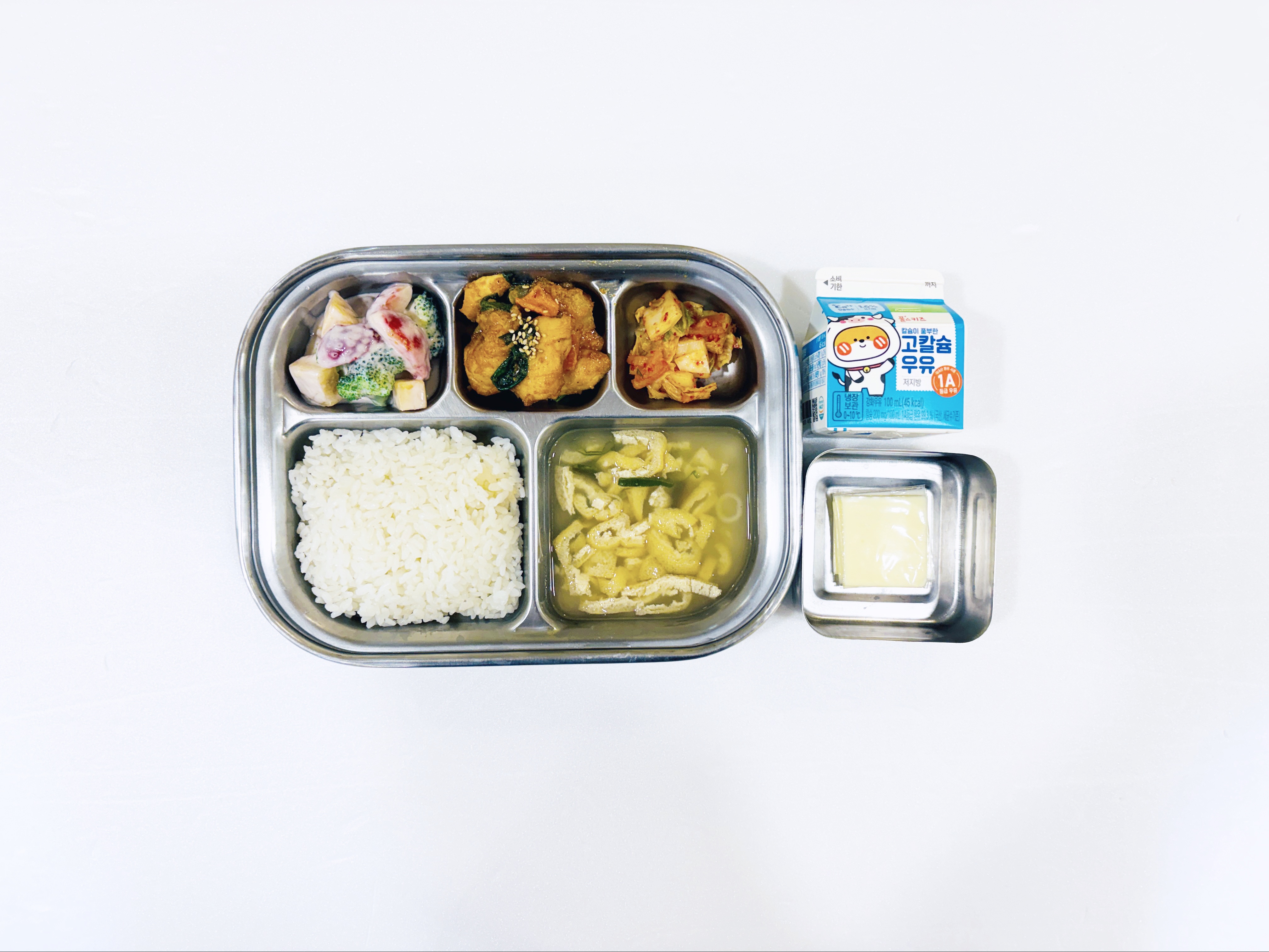 2026.2.4 (수) 중식식단 - 아침간식: 우유 / 백미밥, 유부팟국,닭살양념구이,브로콜리과일샐러드,배추김치,(후)치즈
