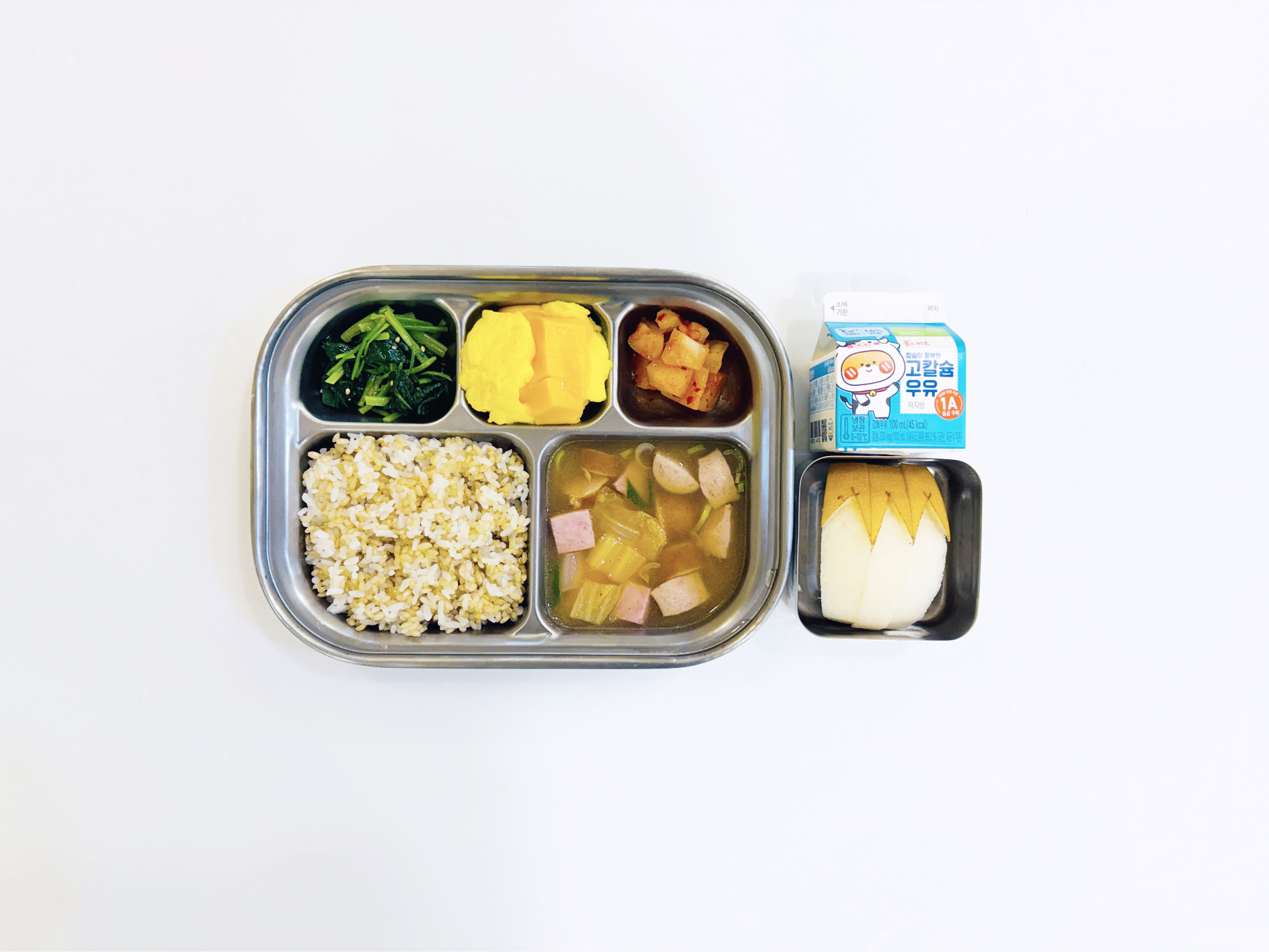 2026.3.19 (목) 중식식단 - 아침간식: 우유 / 쇠고기콩나물밥+양념장,감자된장국,새송이청경채볶음,깍두기 (후)떠먹는 요구르트