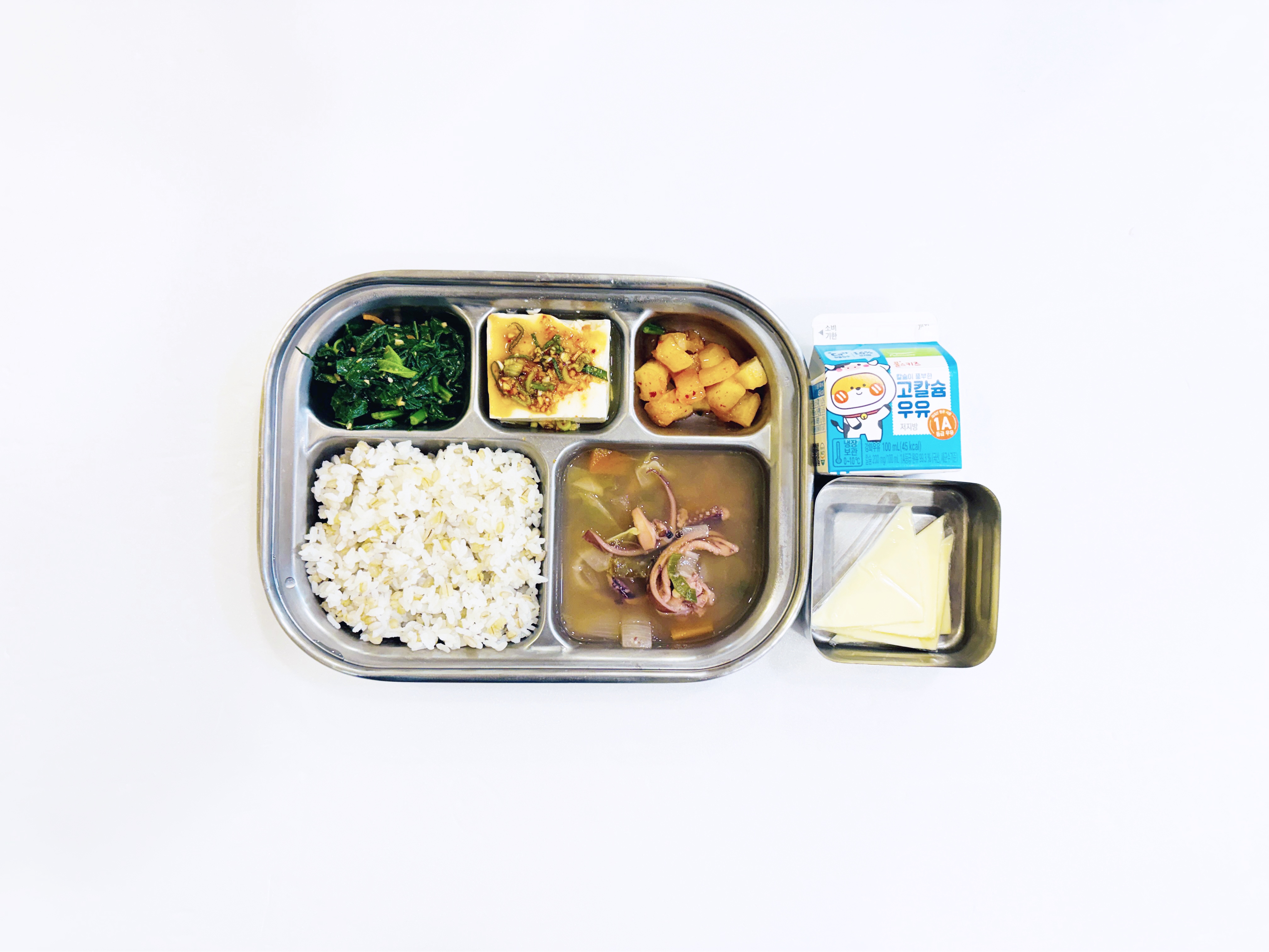 2026.3.25 (수) 중식식단 - 아침간식: 우유 / 보리밥,오징어백짬뽕국,연두부&양념장,아욱나물,깍두기 (후) 치즈