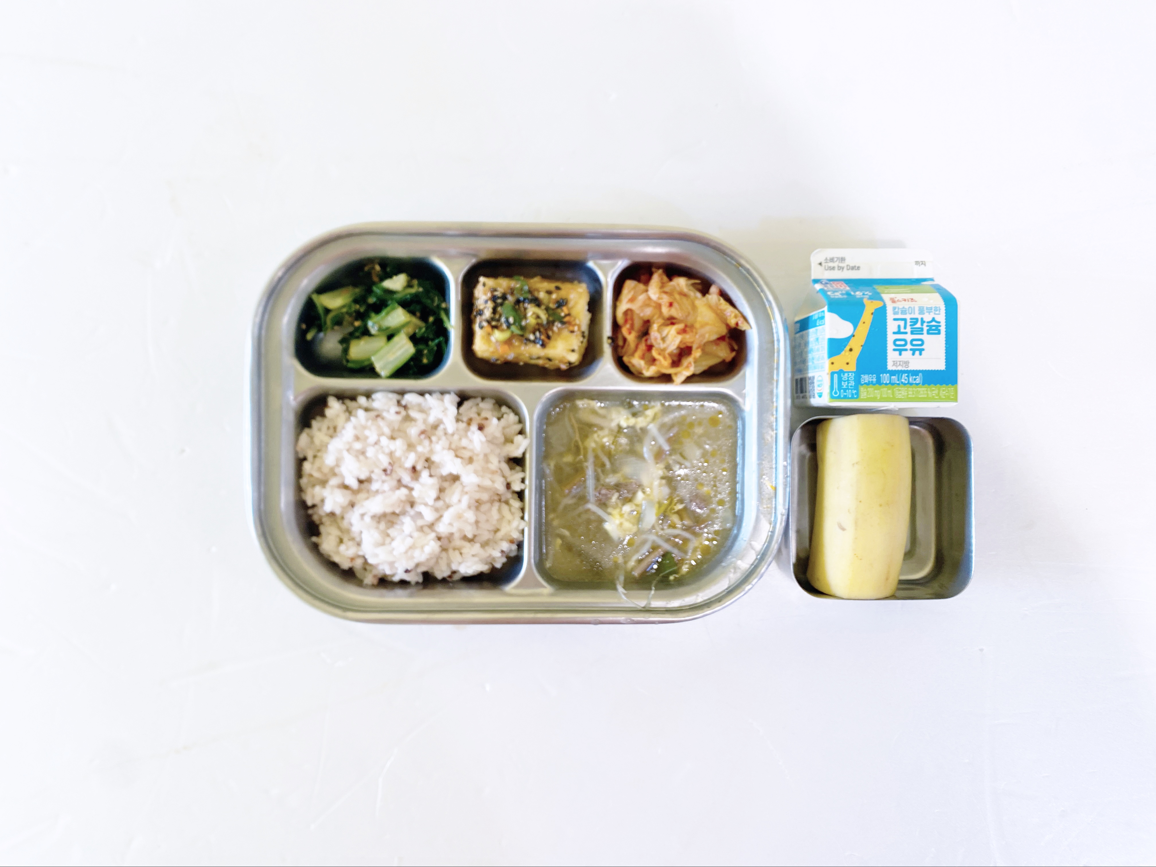2025.10.23(목) 중식식단 - 오전간식:우유 / 현미밥,청경채된장국,쇠고기애호박찜,도토리묵무침,깍두기(후)떠먹는 요쿠르트,견과류