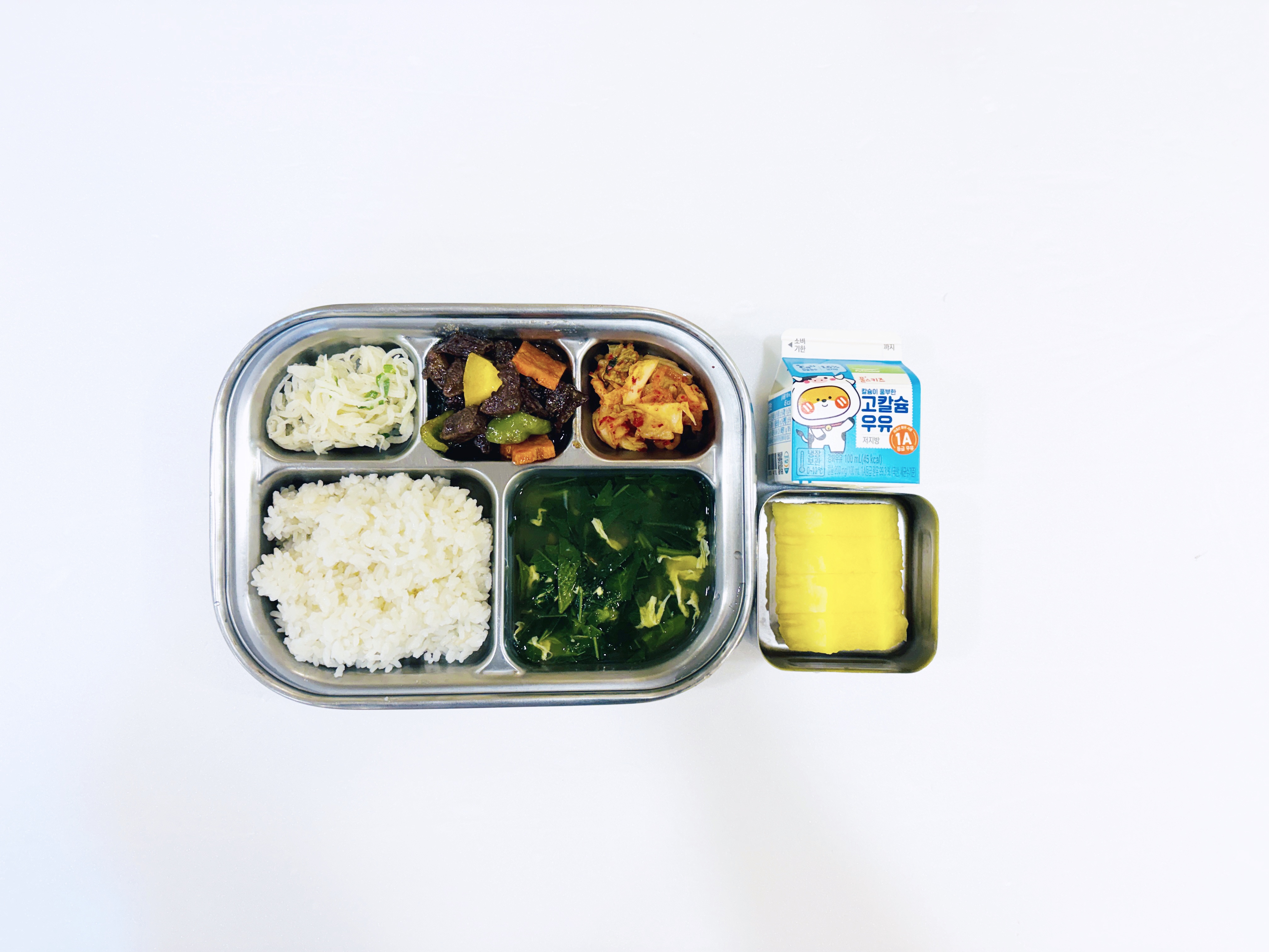 2026.1.26 (월) 중식식단 - 아침간식: 우유 /백미밥,달걀아욱국,쇠고기폭찹,무나물,배추김치 (후) 파인애플 작성자 : 관리자 26-01-26 Next 2026.1.27 (화) 중식식단 - 백미밥,순두부미역국,돼지고기데리야끼구이,방울토마토치커리샐러드,깍두기 (후) 귤,케이크 Prev 2026.1.23 (금) 중식식단 - 아침간식: 우유 / 차조밥,닭살미역국,두부조림, 취나물무침,배추김치 (후) 사과 목록