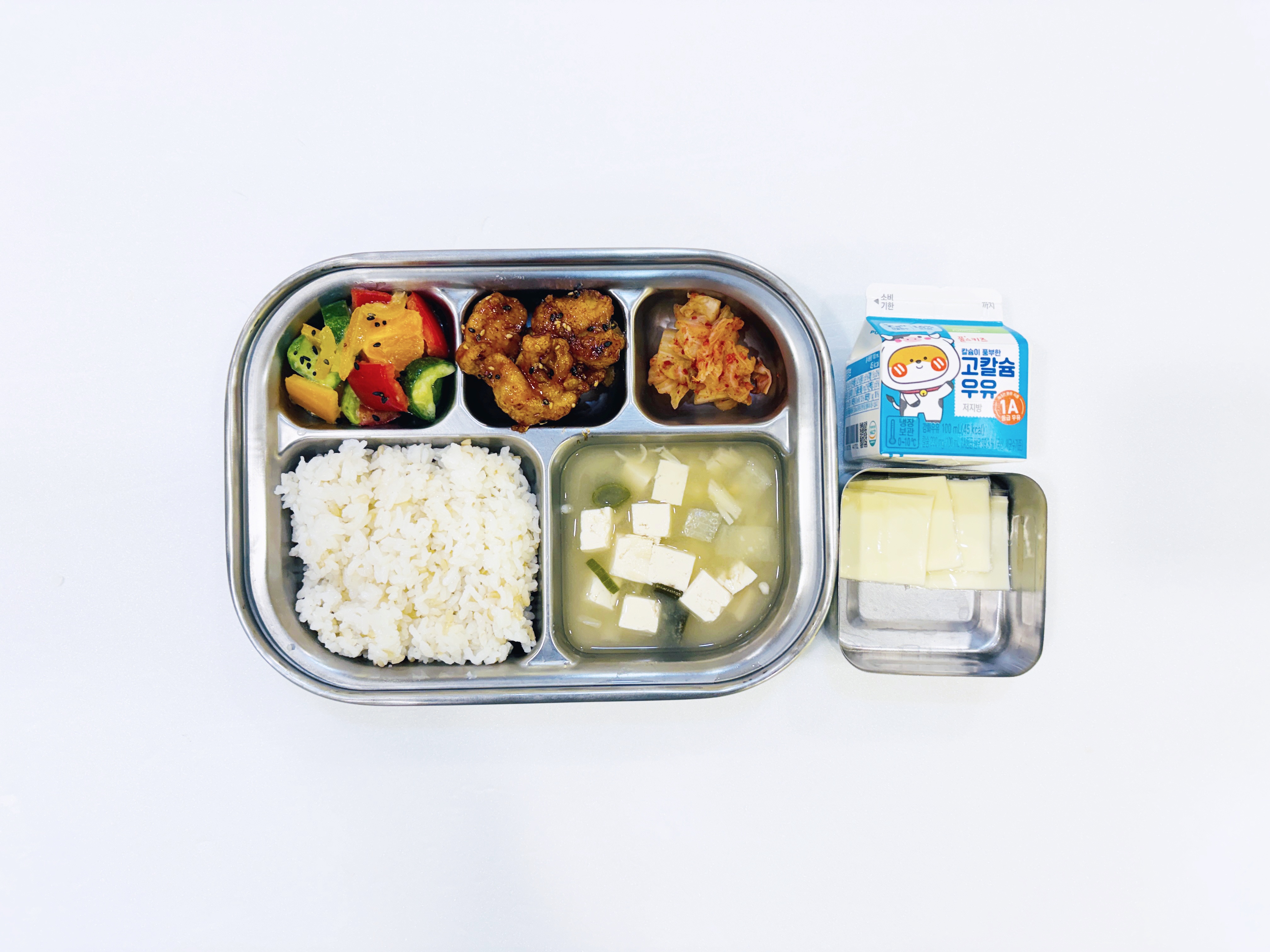 2026.2.20 (금) 중식식단 - 아침간식: 우유, 현미밥/팽이두부미소장국, 닭살폭찹,파프리카유자청무침,배추김치 (후)치즈 작성자 : 관리자 26-02-20 Next 2026.2.23 (월) 중식식단 - 흑미밥,어묵부춧국,돼지고기주물럭,도라지나물,배추김치 (후)바나나 Prev 2026.2.19 (목) 중식식단 - 백미밥,새우살미역국,돼지갈비찜, 양상추오이샐러드,깍두기 (후)귤,케이크 목록