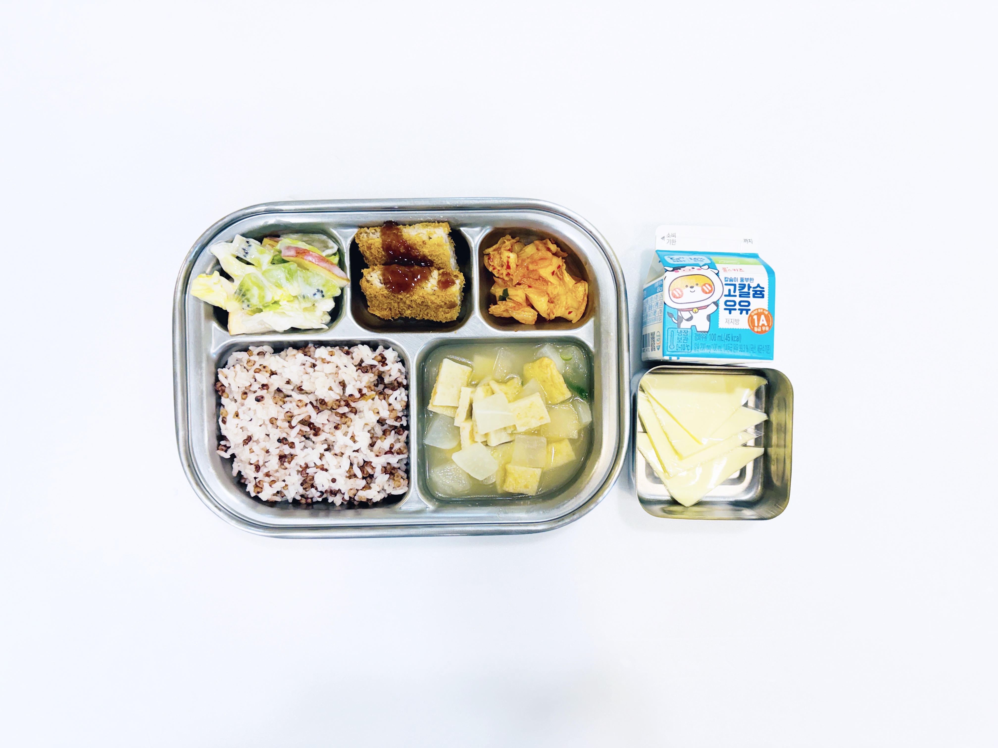 2026.3.18 (수) 중식식단 - 아침간식: 우유 / 수수밥,어묵국,돈까스+소스,양상추과일요거트샐러드,배추김치(후)치즈 작성자 : 관리자 26-03-18 Next 2026.3.19 (목) 중식식단 - 아침간식: 우유 / 쇠고기콩나물밥+양념장,감자된장국,새송이청경채볶음,깍두기 (후)떠먹는 요구르트 Prev 2026.3.17 (화) 중식식단 - 아침간식: 우유 / 백미밥,닭곰탕,간장두부조림,열무무침,배추김치(후)바나나 목록