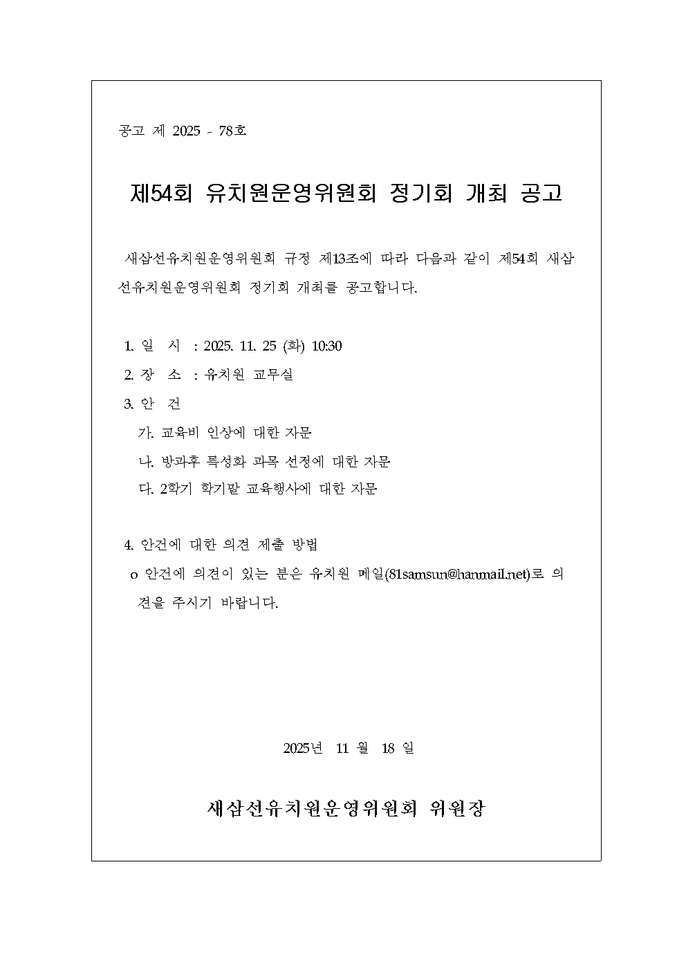 소식란 새삼선갤러리 행사달력 급식 운영위원회 입학안내 운영운영회 제54회 유치원운영위원회 정기회 개최 공고 작성자 : 관리자 25-11-18 Next 제54회 유치원운영위원회 회의록 안내 Prev 제53회 유치원운영위원회 회의록 안내 목록