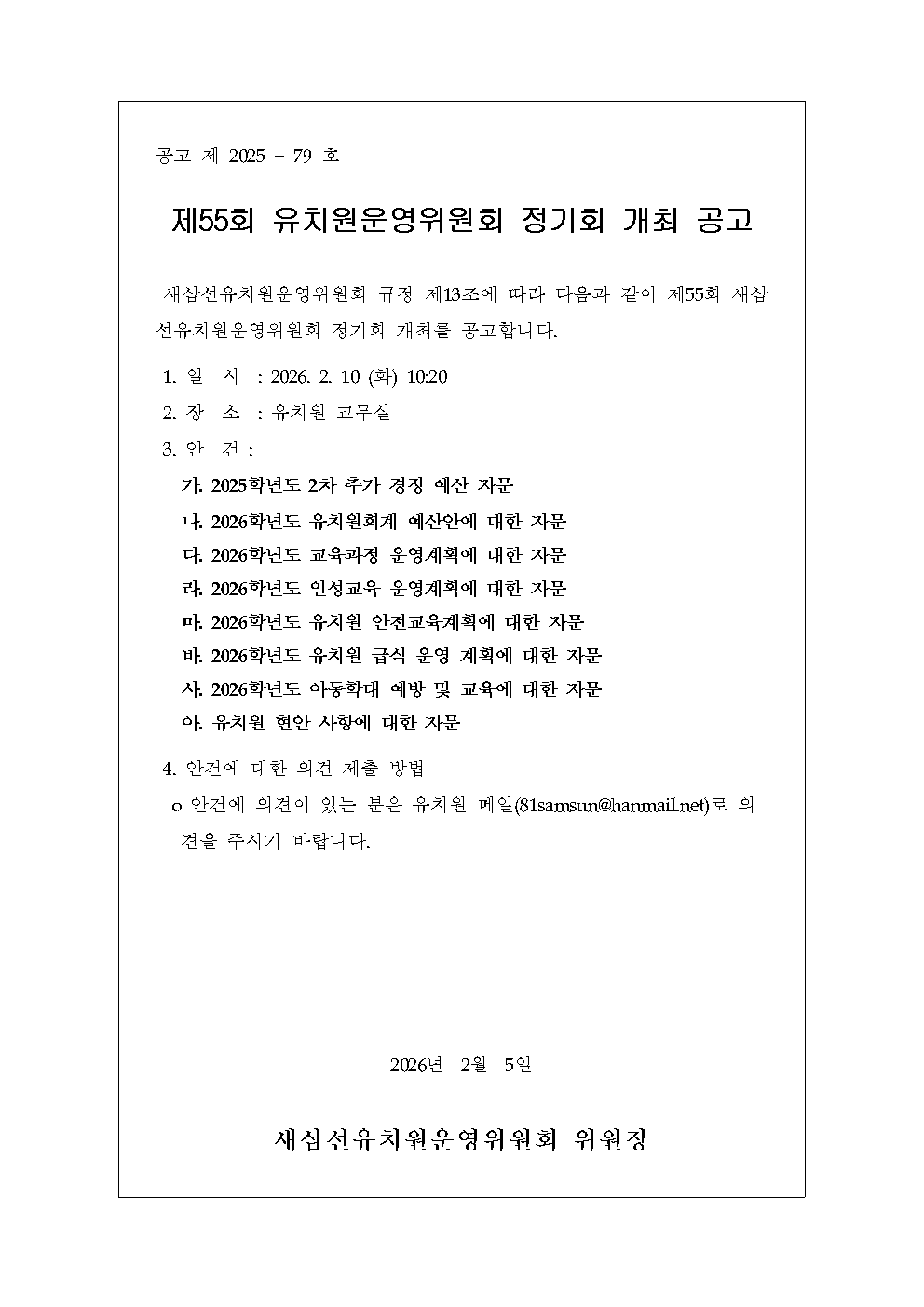 소식란 새삼선갤러리 행사달력 급식 운영위원회 입학안내 운영운영회 제55회 유치원운영위원회 정기회 개최 공고 작성자 : 관리자 26-02-05 Next 2026학년도 세입예산서 Prev 제54회 유치원운영위원회 회의록 안내 목록