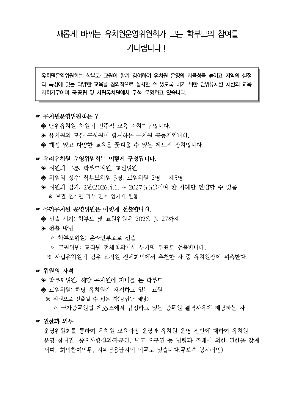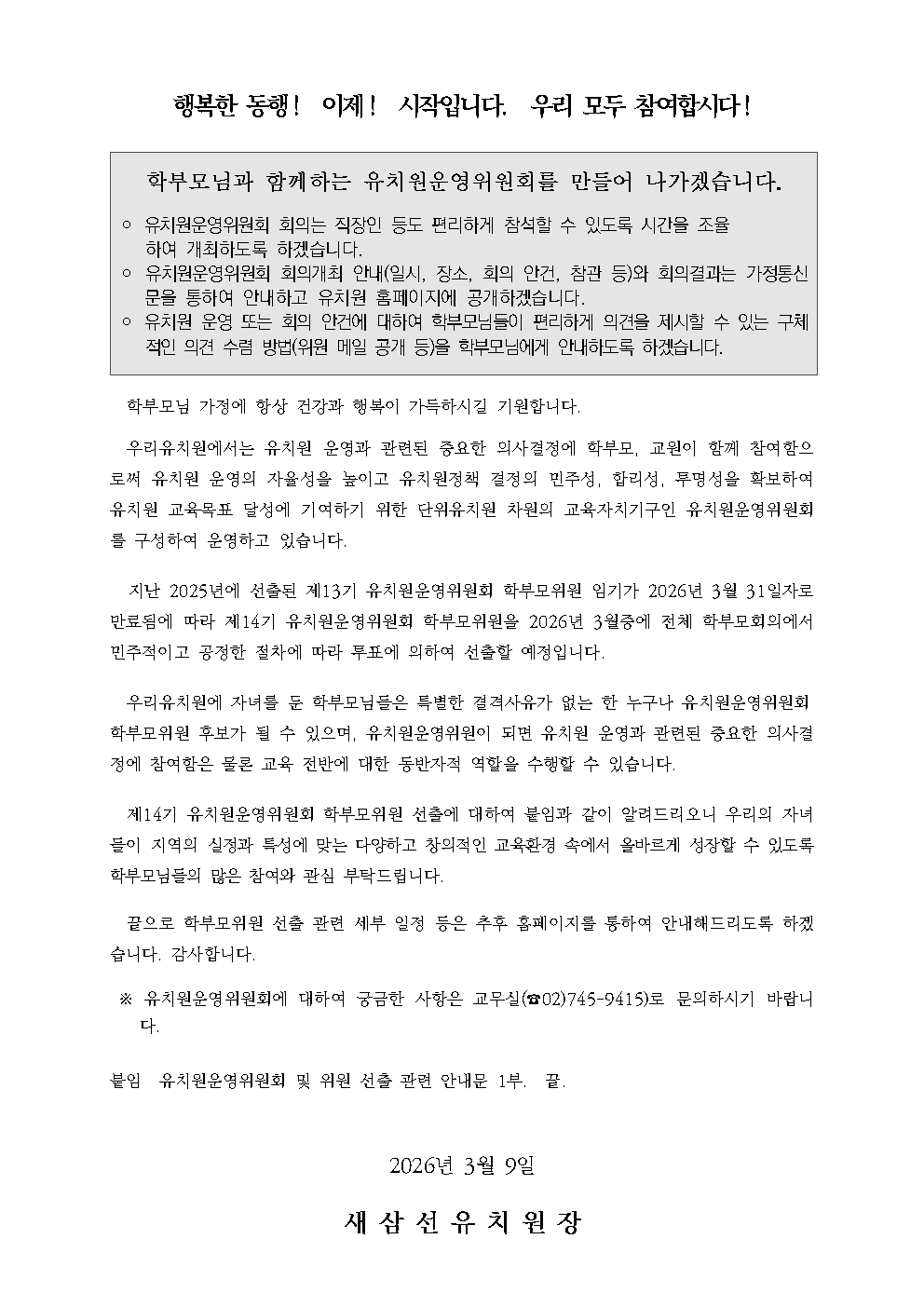 제14기 새삼선유치원운영위원회 위원 선출을 위한 홍보 안내문 작성자 : 관리자 26-03-16 Next 제14기 유치원운영위원회 학부모위원 선출 공고 안내 Prev 제55회 유치원운영위원회 회의록 안내 목록