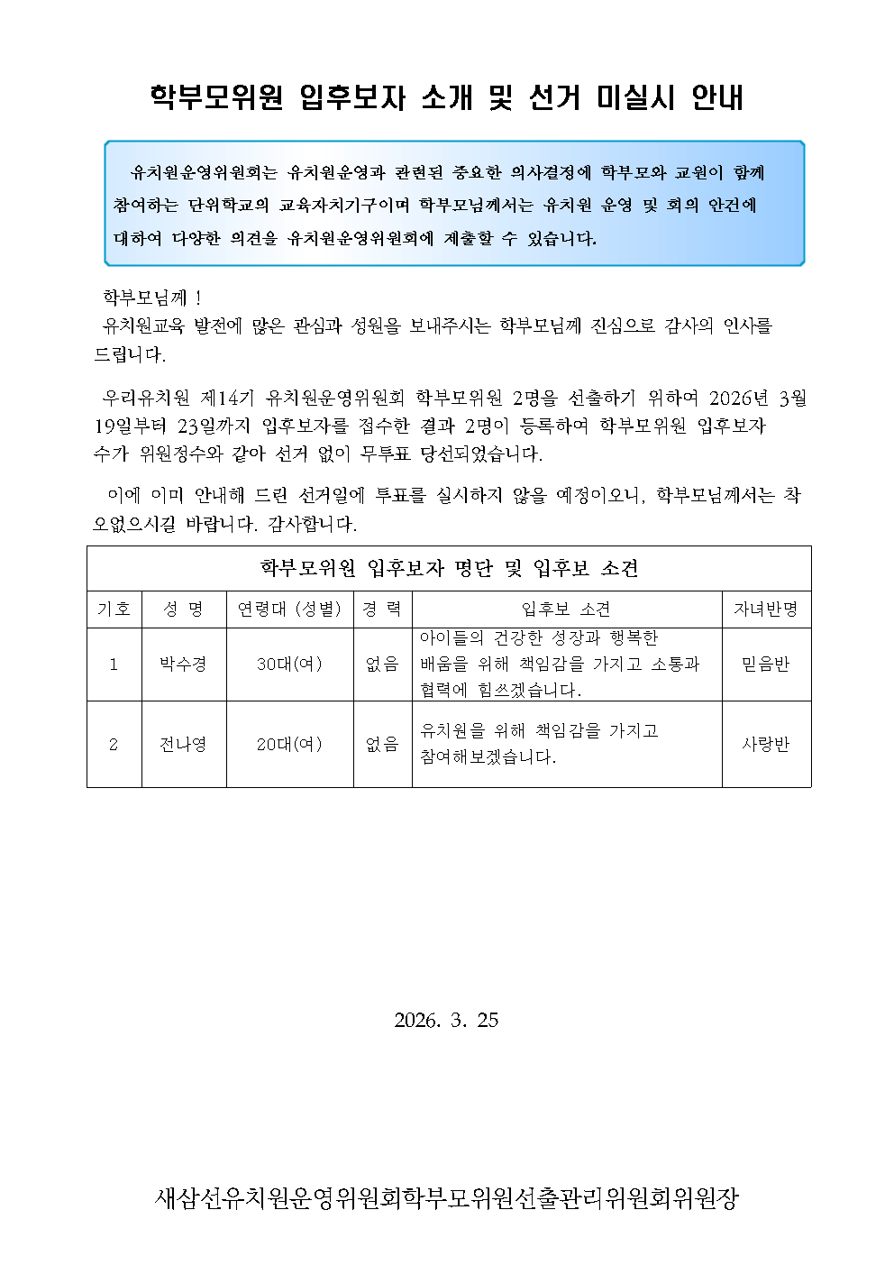 제14기 학부모위원 입후보자 소개 및 선거 미실시 안내 작성자 : 관리자 26-03-25 Next 제14기 운영위원회 구성 결과 안내 Prev 2025학년도 3차추경 세출예산서 목록