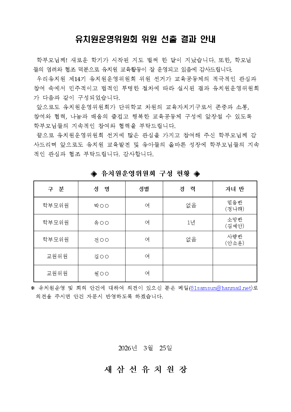 제14기 운영위원회 구성 결과 안내 작성자 : 관리자 26-03-25 Next 제56회 유치원운영위원회 정기회 개최 공고 Prev 제14기 학부모위원 입후보자 소개 및 선거 미실시 안내 목록