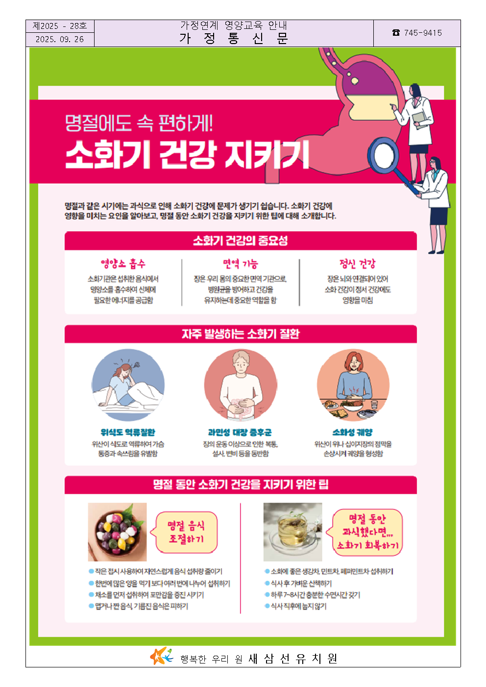 소식란 새삼선갤러리 행사달력 급식 운영위원회 입학안내 급식알리미 9월 가정연계 - 영양교육 (명절에도 속 편하게! 소화기 건강 지키기) 작성자 : 관리자 25-09-26 Next 2025학년도 10월 식단표 Prev 2025학년도 상반기(3월~8월) 유치원급식 식품비 사용 비율 안내 목록