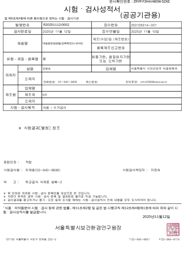 2025년 하반기 학교급식 공동구매 식재료(김치, 친환경 쌀) 안전성검사 결과 안내 작성자 : 관리자 25-11-14 Next 11월 가정연계 - 영양교육 (겨울철 면역력을 높여주는 발효식품의 매력!) Prev 2025학년도 11월 식단표 목록