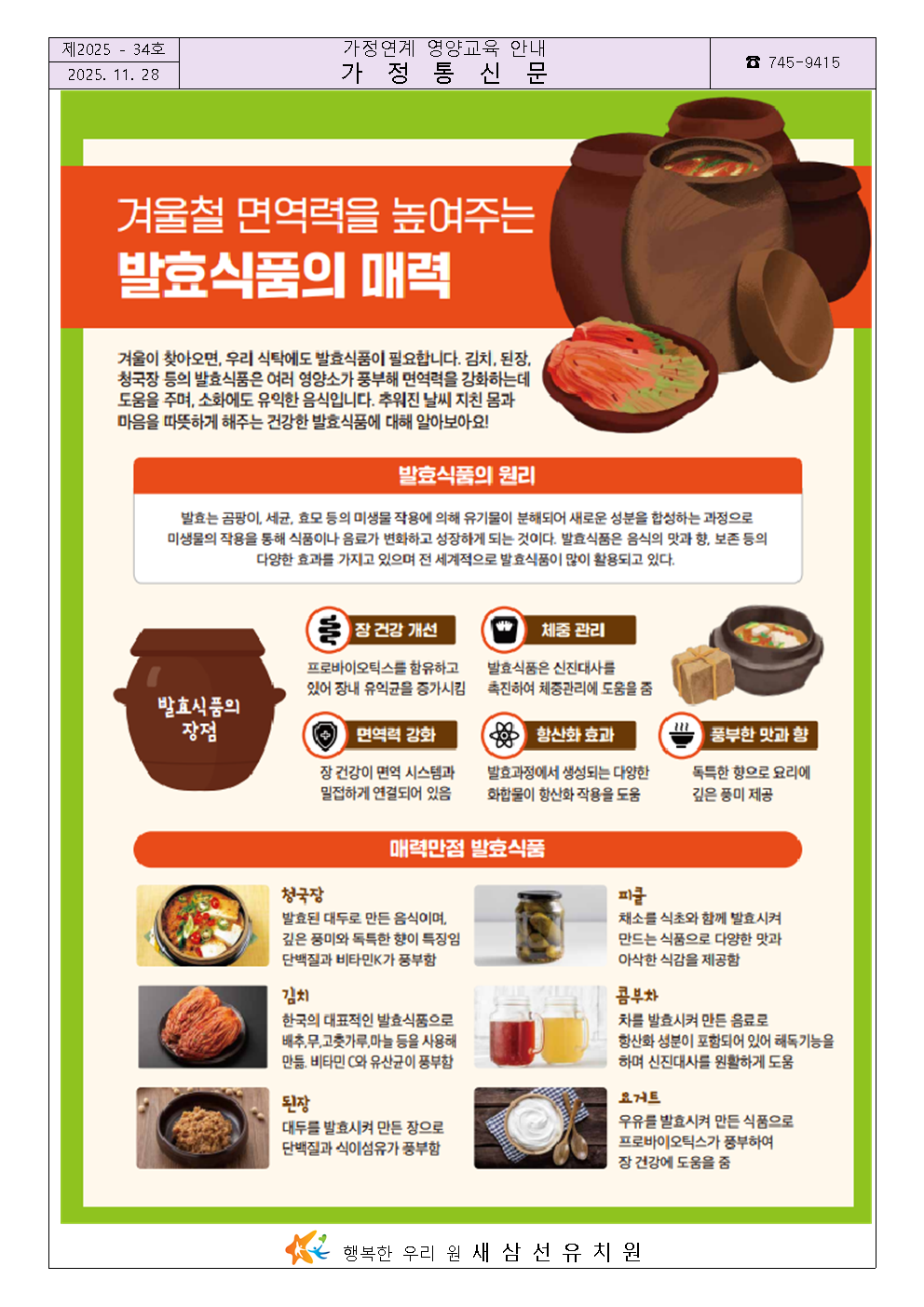11월 가정연계 - 영양교육 (겨울철 면역력을 높여주는 발효식품의 매력!) 작성자 : 관리자 25-11-28 Next 2025학년도 12월 식단표 Prev 2025년 하반기 학교급식 공동구매 식재료(김치, 친환경 쌀) 안전성검사 결과 안내 목록