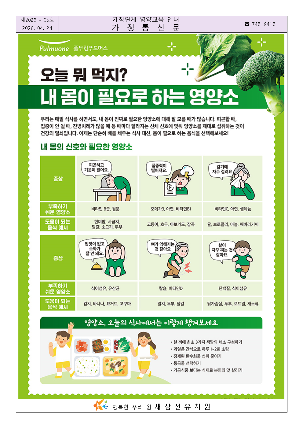 소식란 새삼선갤러리 행사달력 급식 운영위원회 입학안내 급식알리미 2026년 4월 가정연계 - 영양교육 (내 몸이 필요로 하는 영양소) 작성자 : 관리자 26-04-24 Next 2026년 5월 식단표 Prev 2026년 4월 식단표 목록