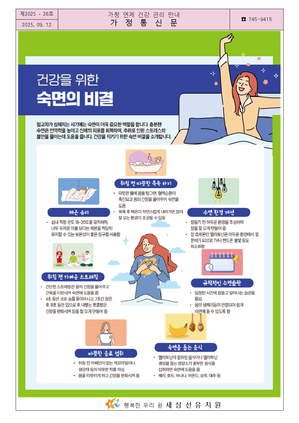 소식란 새삼선갤러리 행사달력 급식 운영위원회 입학안내 소식란 9월 안전관리통신문 -자전거, 킥보드 안전 수칙 안내 작성자 : 관리자 25-09-19 댓글 댓글등록 Prev 9월 건강관리통신문 - 건강을 위한 숙면의 비결 목록