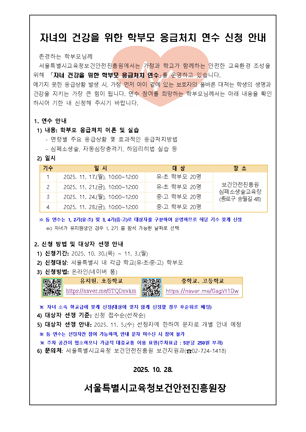 (보건진흥원) 2025년 자녀의 건강을 위한 학부모 응급처치 연수 신청 안내