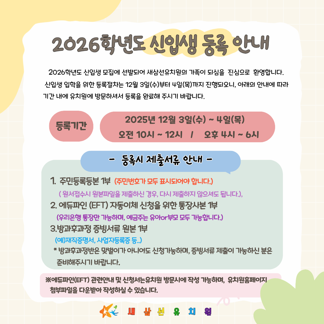 소식란 새삼선갤러리 행사달력 급식 운영위원회 입학안내 소식란 2025학년도 신입생 합격자 등록 안내 (에듀파인 EFT 신청서 파일 첨부) 작성자 : 관리자 25-11-25 첨부파일 : 2025-01 신입생 EFT 관련 통신문.hwp * 에듀파인 EFT 관련 안내 및 신청서는 아래의 첨부파일을 다운받아 제출해주시기 바랍니다. (방문시 작성 가능합니다.) 댓글 댓글등록 Prev 10월 건강관리통신문 - 내 몸을 위한 클린 이팅 목록