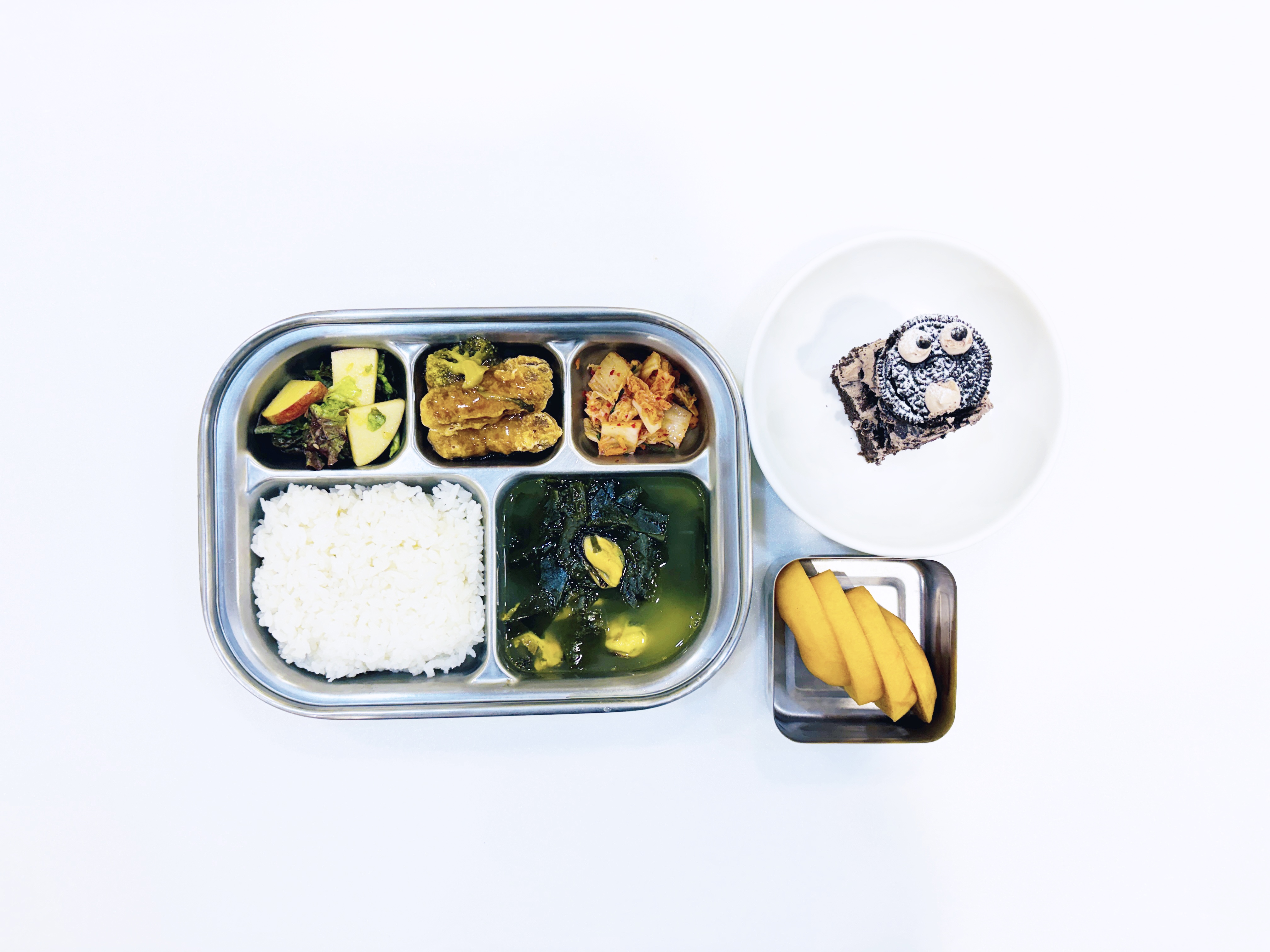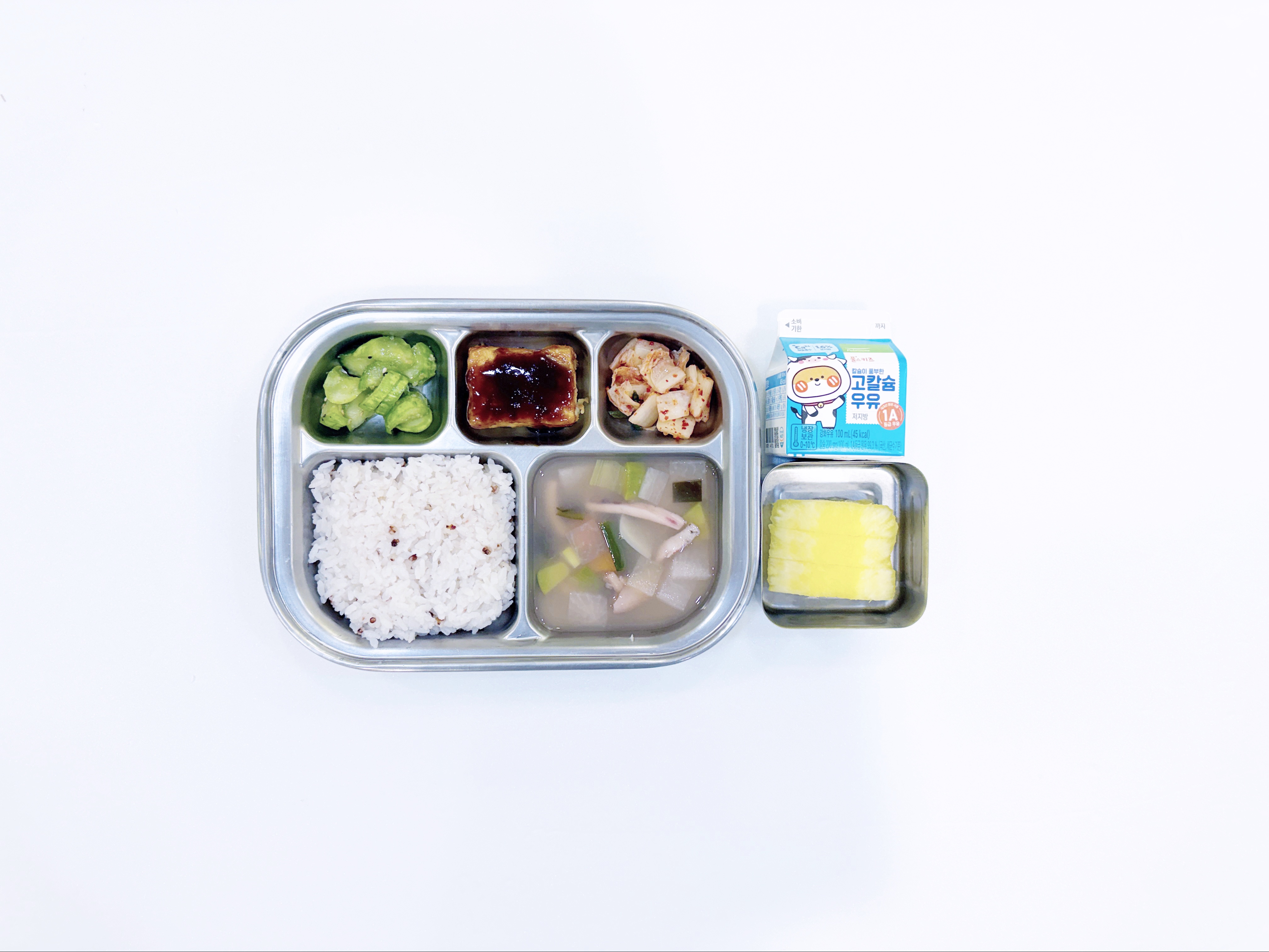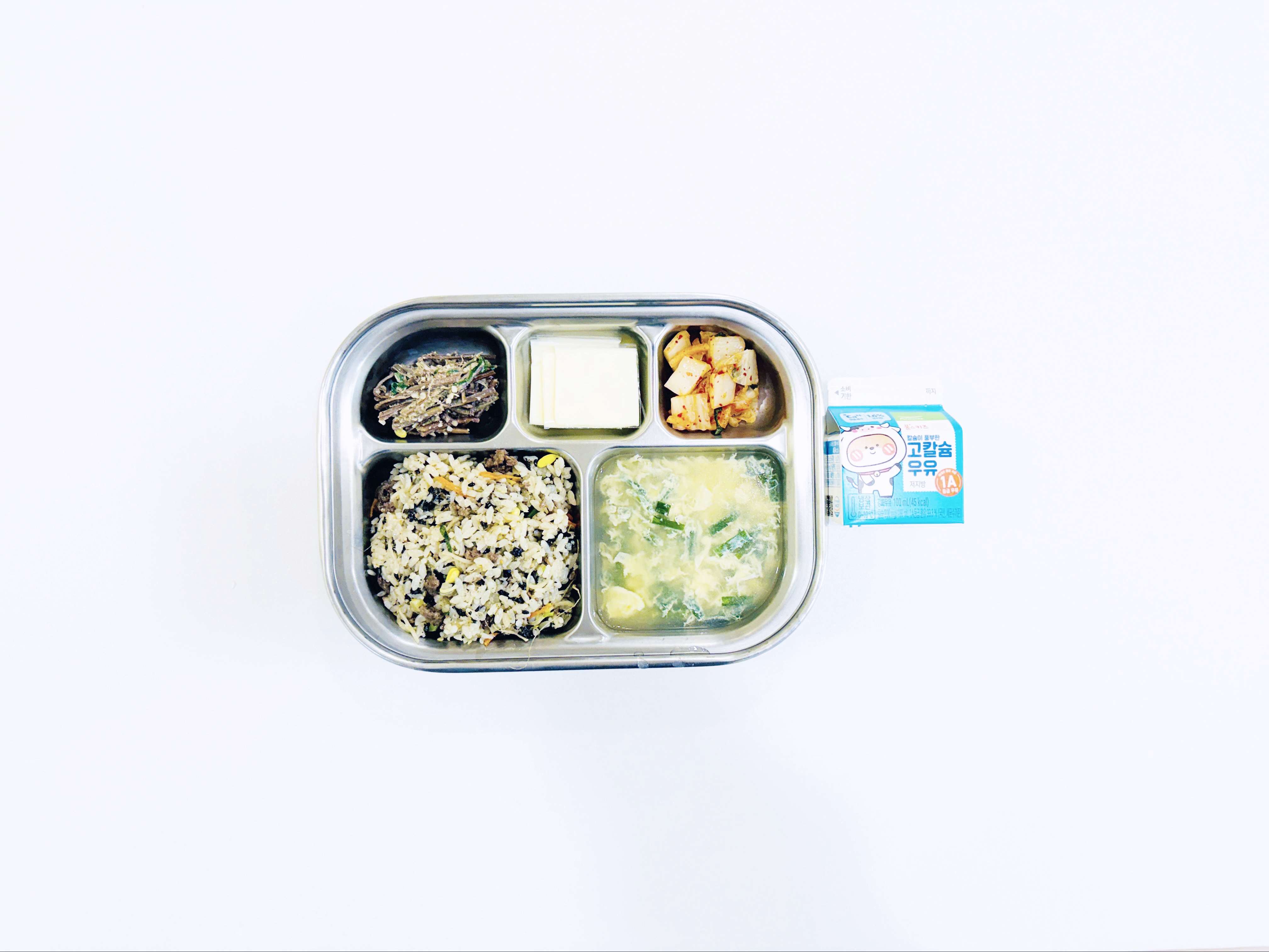 2025.12.3 (수) 중식식단 - 오전간식:우유 / 쇠고기콩나물밥+양념장,달걀부춧국,고사리나물,배추김치(후)치즈