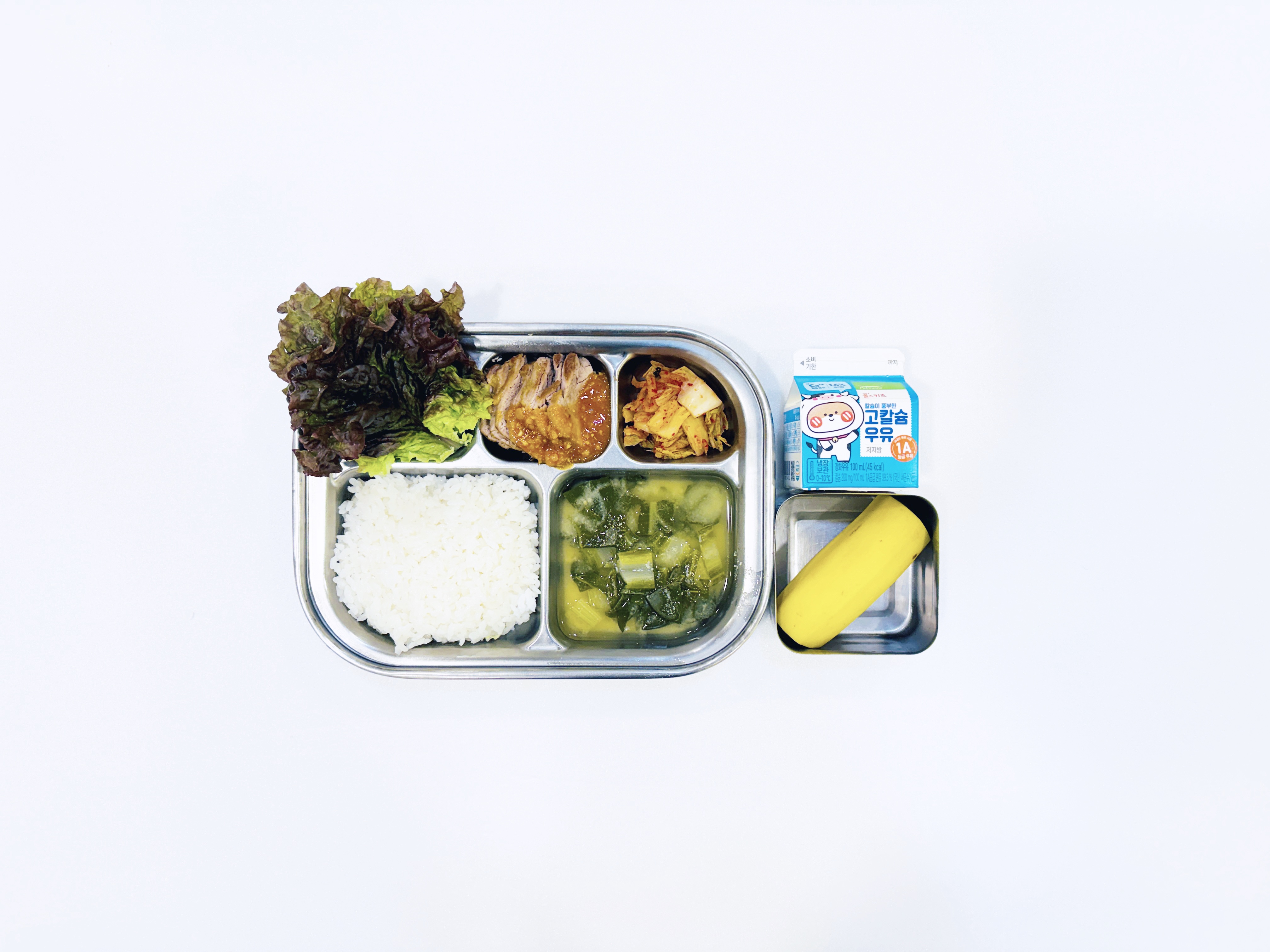 2025.12.2 (화) 중식식단 - 오전간식:우유 / 백미밥,근대된장국,돼지고기수육,상추쌈&쌈장,배추김치(후)바나나