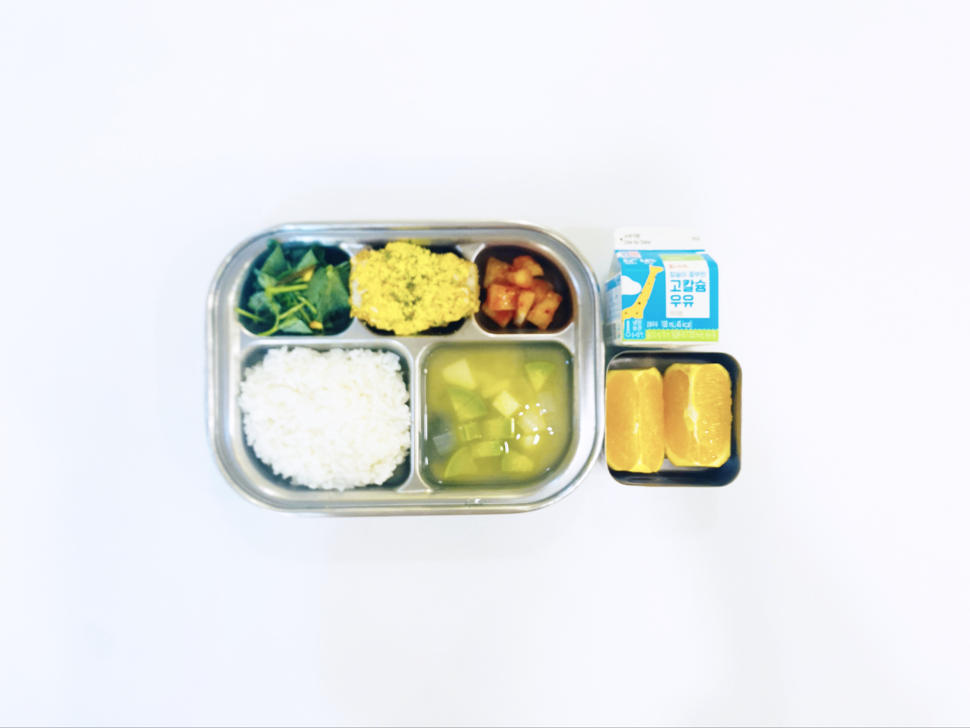 2025.11.10(월) 중식식단 - 오전간식:우유 / 백미밥,애호박된장국,생선까스&소스,참나물유차청무침,깍두기(후)오렌지