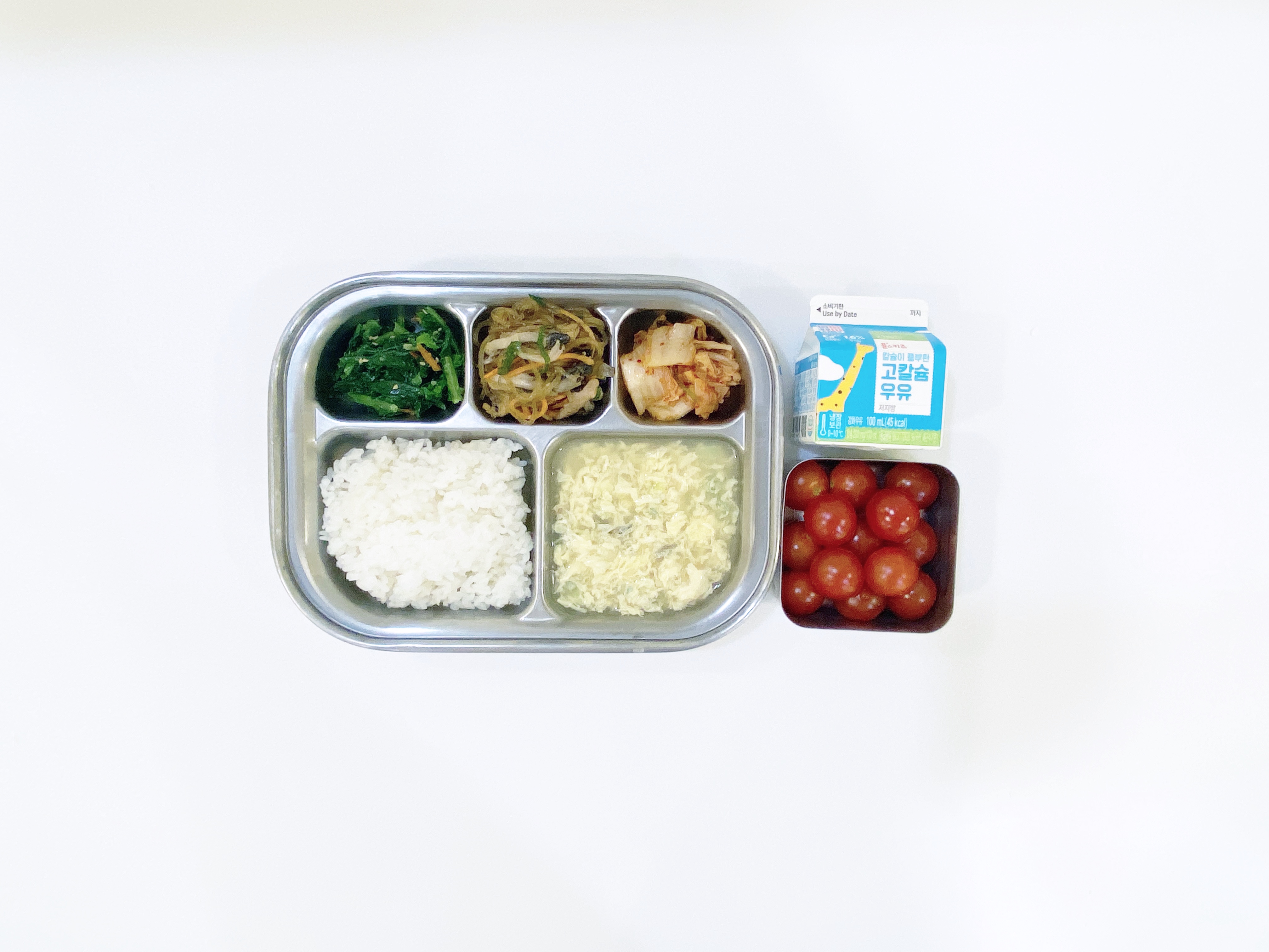 2025.11.12(수) 중식식단 - 오전간식:우유 / 돼지고기잡채덮밥,달걀탕,열무나물,배추김치(후)방울토마토