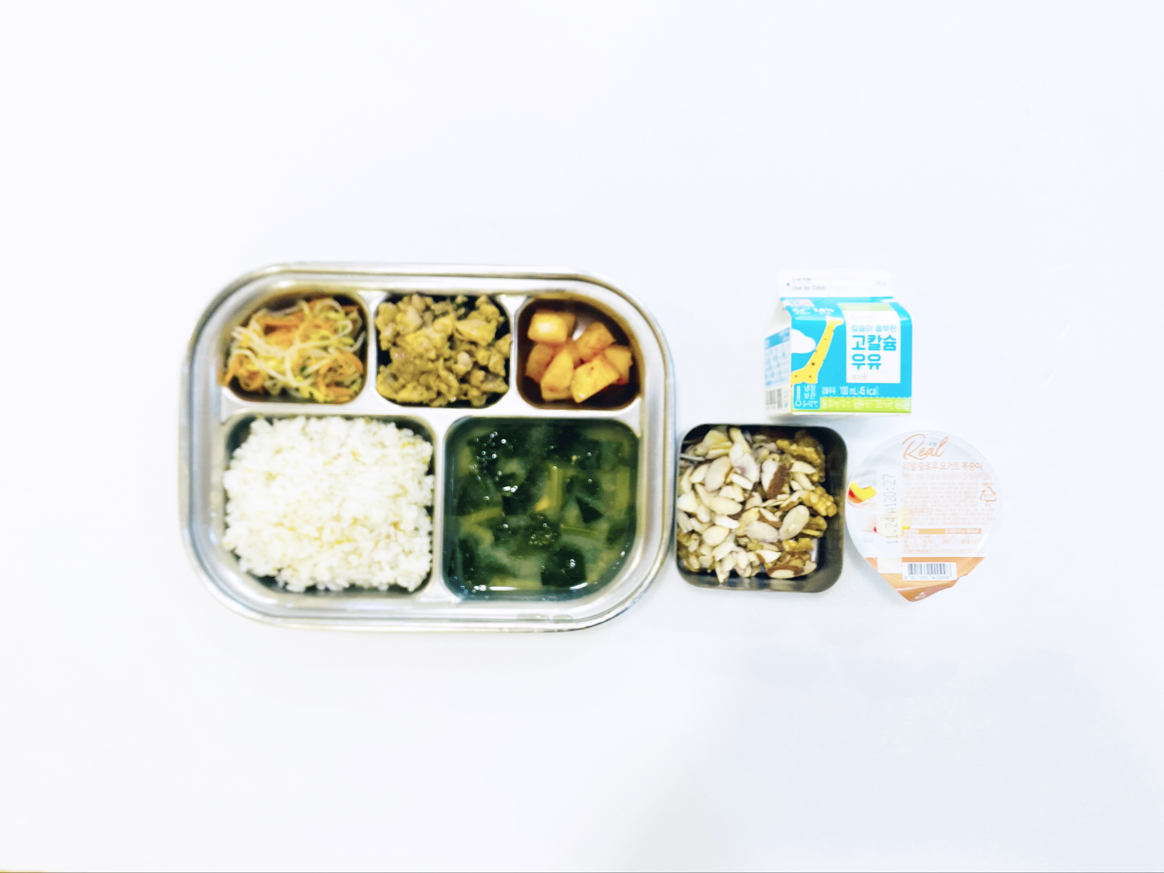 2025.11.13(목) 중식식단 - 오전간식:우유 / 차조밥, 시금치된장국,닭살장조림,숙주당근무침,깍두기(후)떠먹는 요쿠르트&견과류