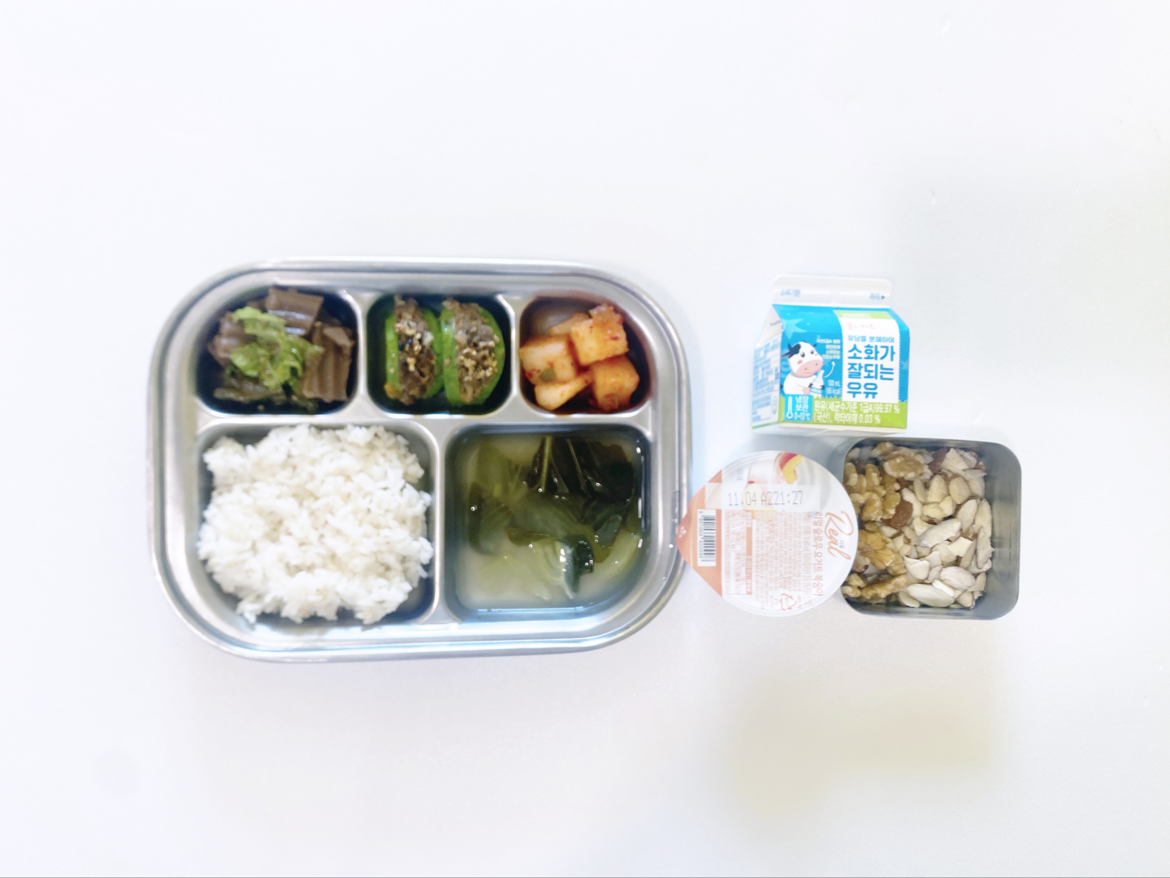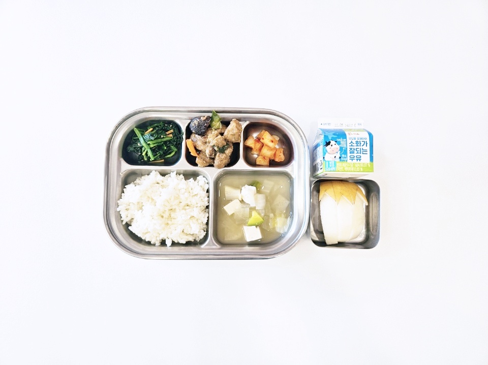 2025.10.23(목) 중식식단 - 오전간식:우유 / 현미밥,청경채된장국,쇠고기애호박찜,도토리묵무침,깍두기(후)떠먹는 요쿠르트,견과류