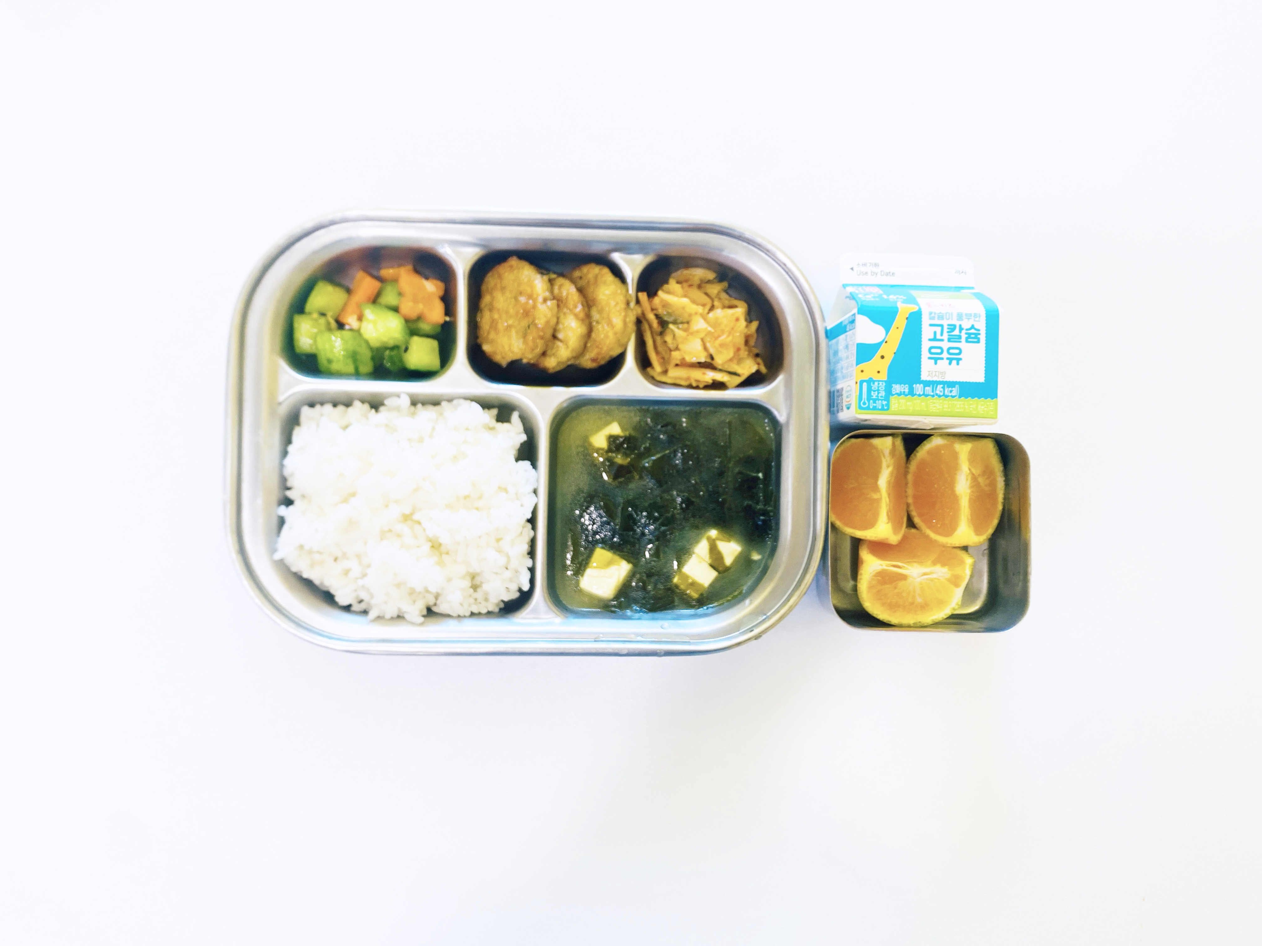 2025.10.24(금) 중식식단 - 오전간식:우유 / 백미밥, 두부미역국,동그랑땡전,오이무침,배추김치 (후)감귤