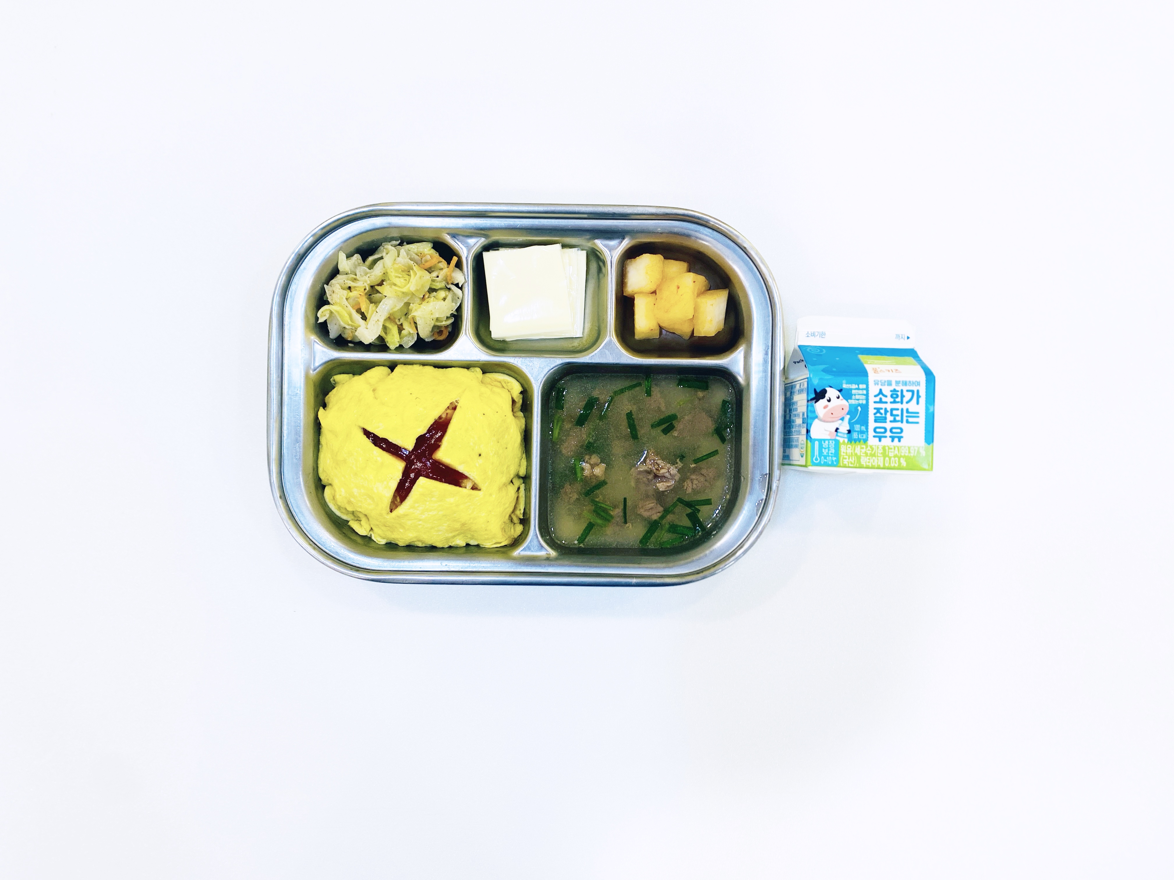 2025.10.29(수) 중식식단 - 오전간식:우유 / 오므라이스,쇠고기부춧국,들깨양배추나물,깍두기 (후)치즈