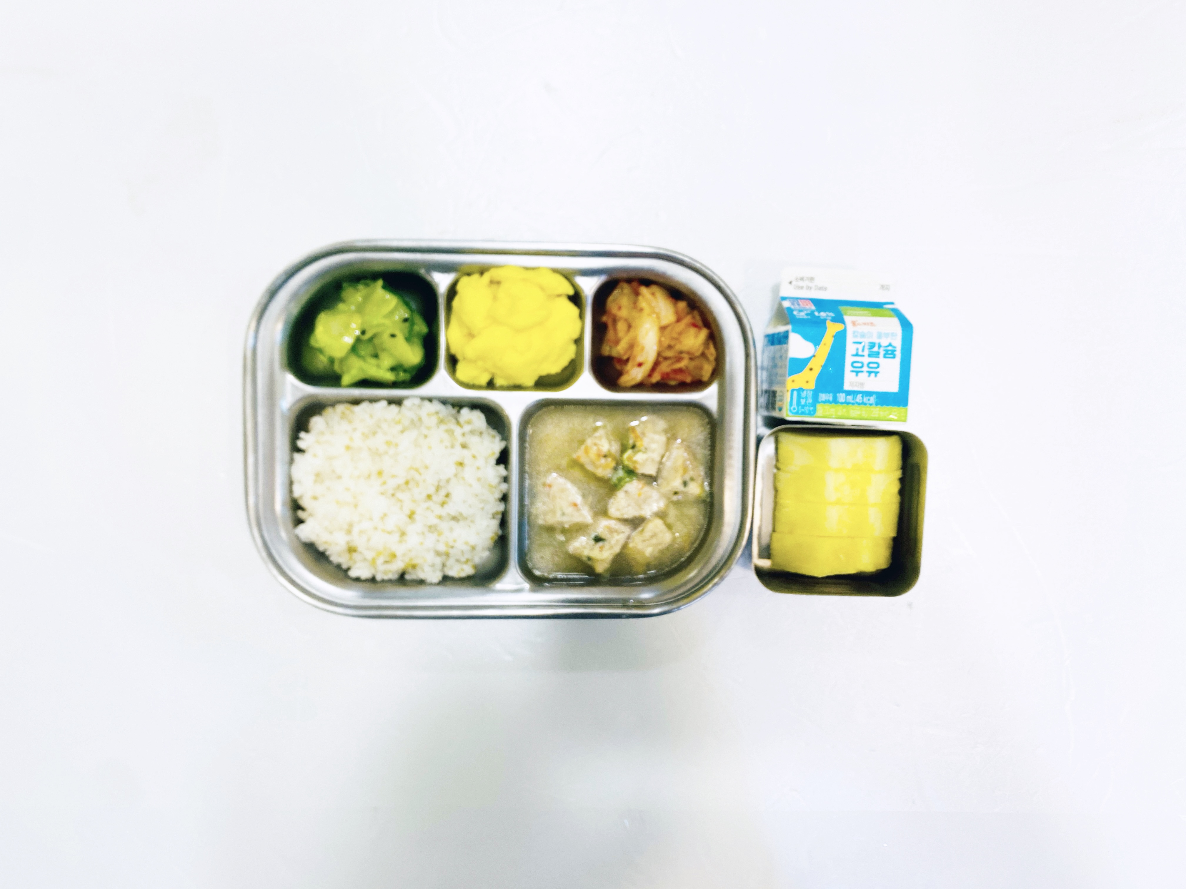 2025.9.29(월) 중식식단 - 오전간식:우유 / 차조밥, 돼지고기완자탕,스크램블에그,오이볶음,배추김치(후)파인애플
