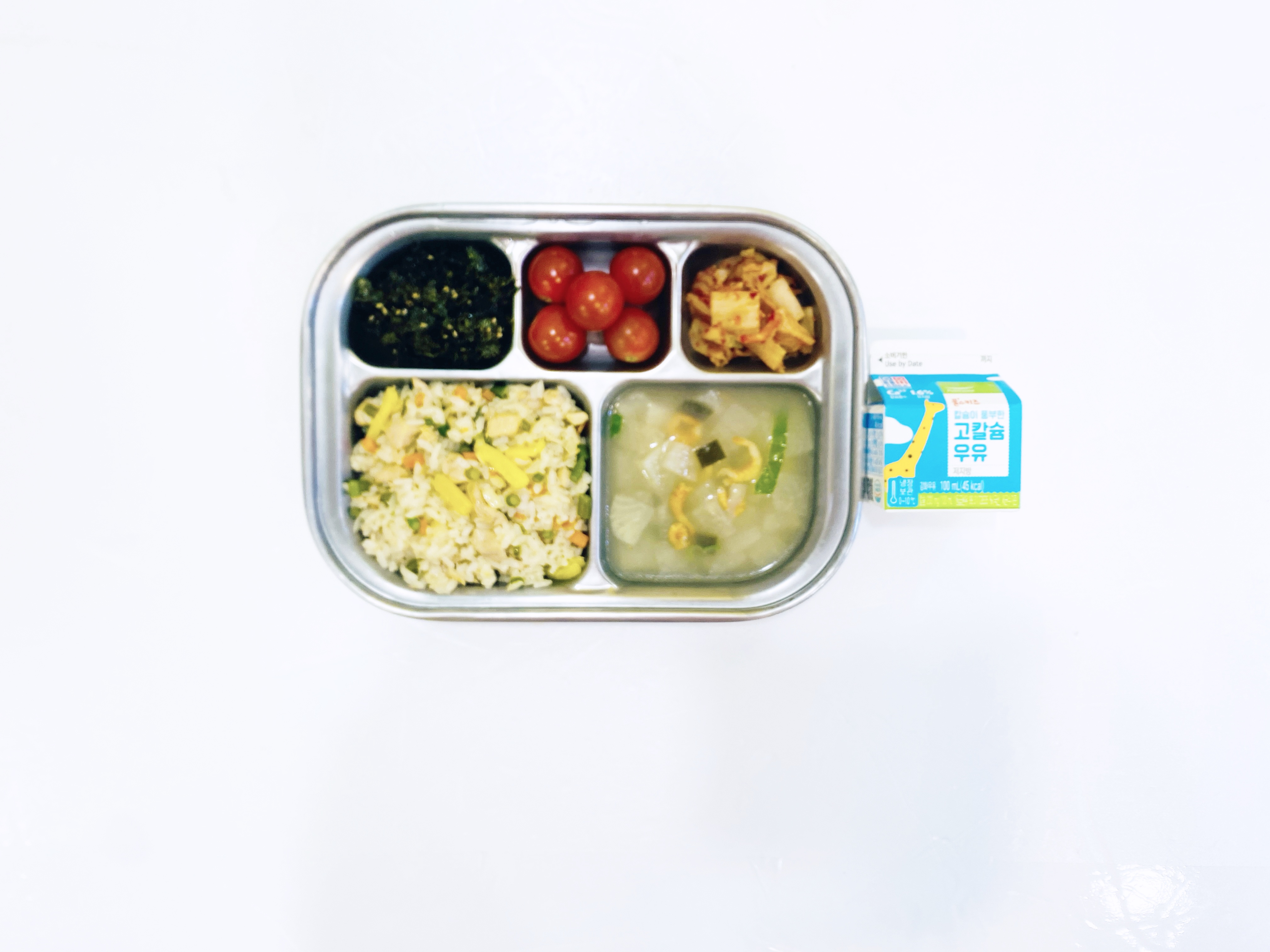 2025.10.1(수) 중식식단 - 오전간식:우유 / 닭살파인애플마늘쫑볶음밥,건새우뭇국,김자반,배추김치(후)방울토마토