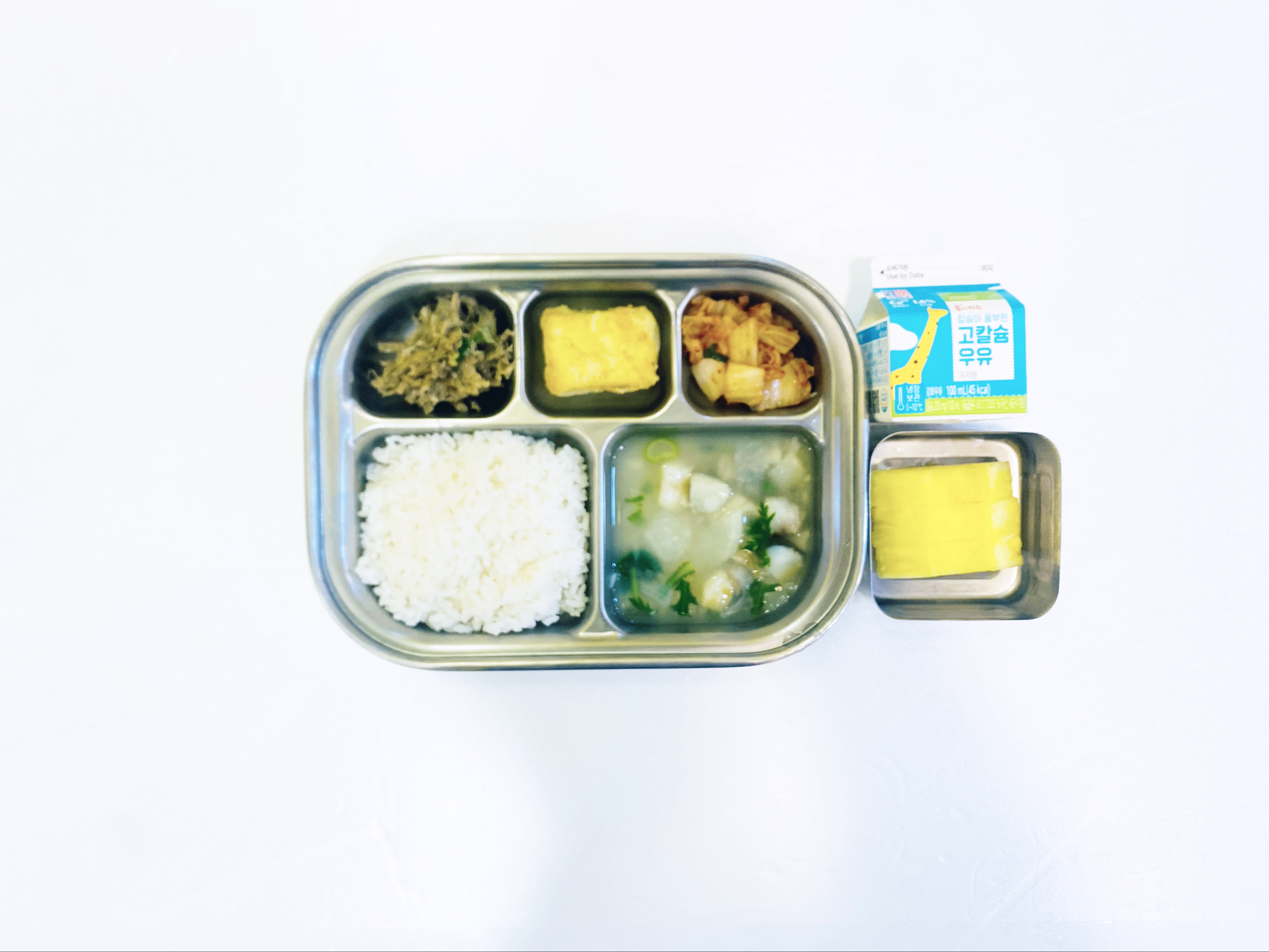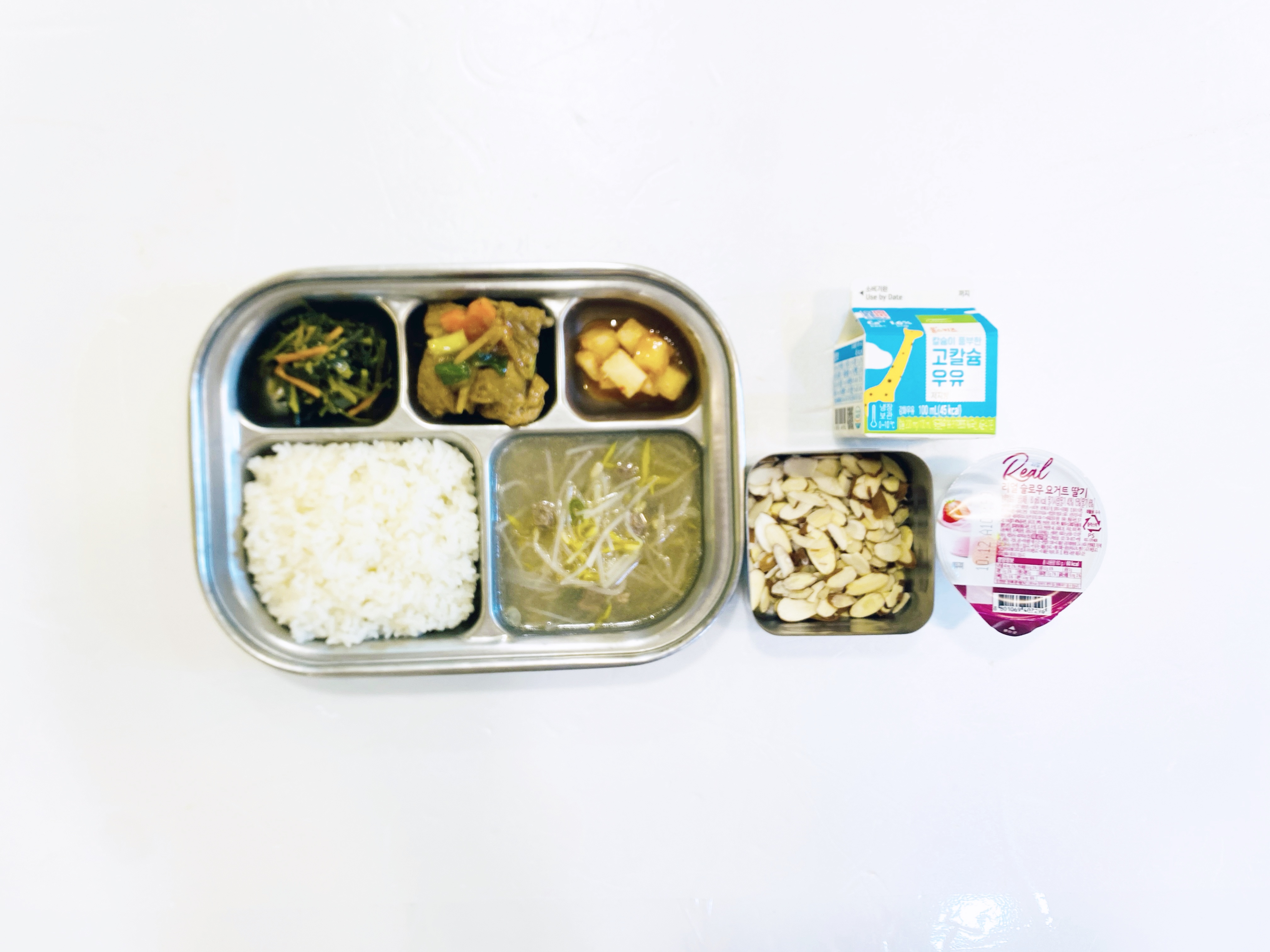 2025.10.2(목) 중식식단 - 오전간식:우유 / 백미밥,쇠고기뭇국,우엉돼지갈비찜,취나물무침,깍두기(후)떠먹는 요쿠르트&견과류