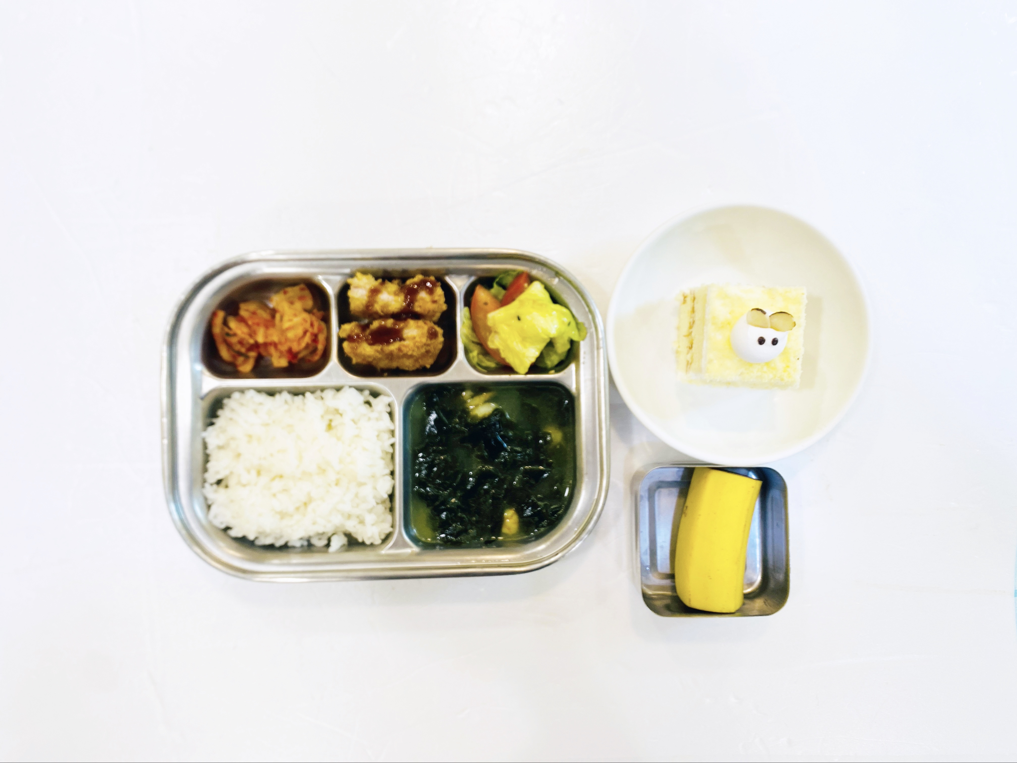 2025.9.25(목) 중식식단 - 오전간식:우유 / 백미밥,새우살미역국,돈까스&소스,토마토치커리샐러드,배추김치(후)바나나,케잌