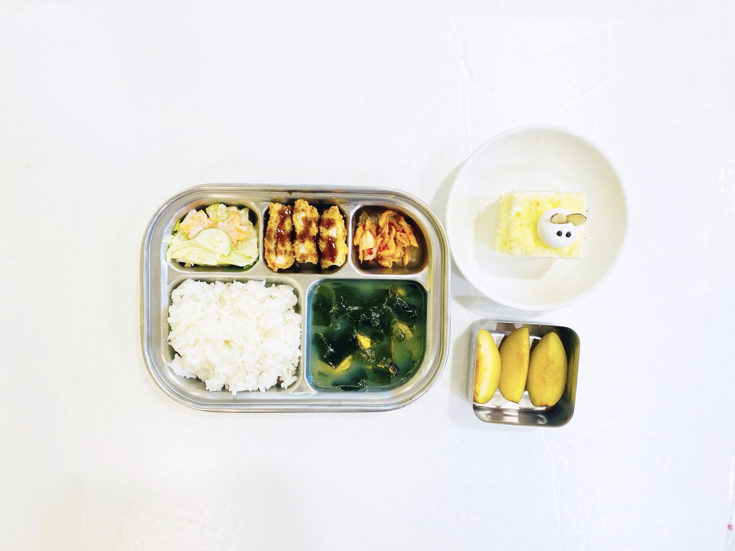 2025.7.24(목) 중식식단 - 백미밥,홍합살미역국,돈까스&소스,크랜베리양상추샐러드,배추김치 (후)자두, 케이크