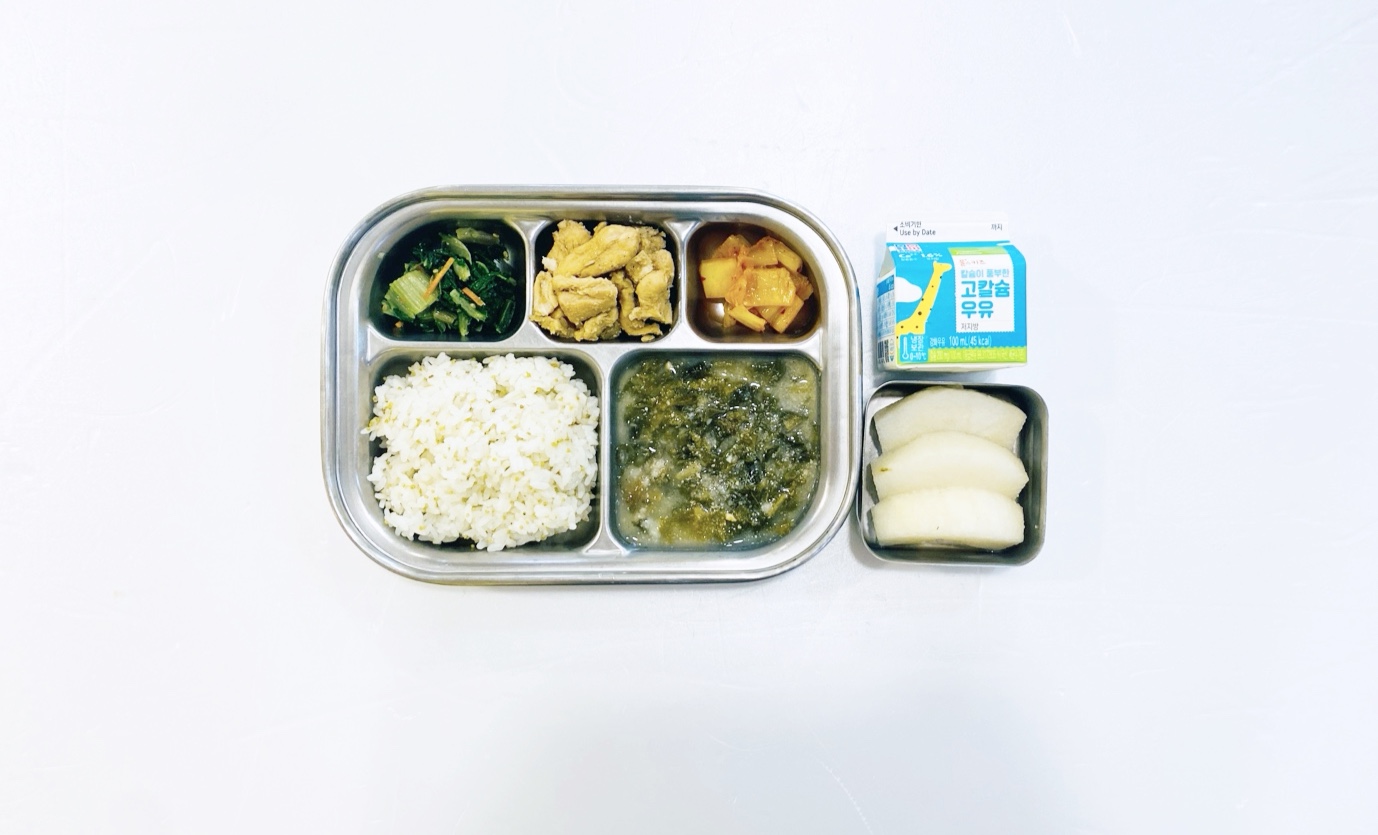 2025.5.22(목) 중식식단 - 오전간식:우유 /차조밥,들깨시래기탕,닭살장조림,근대나물,배추김치 (후)배