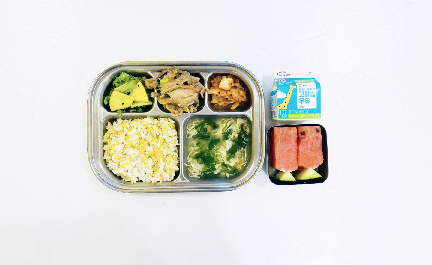 2025.5.26(월) 중식식단 - 오전간식:우유 /기장밥,달걀쑥갓국,돼지불고기,치커리사과무침,배추김치 (후)수박