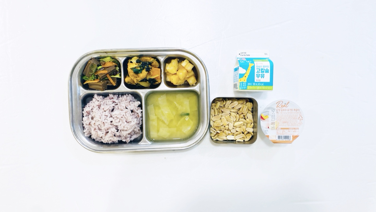 2025.5.27(화) 중식식단 - 오전간식:우유 /흑미밥,양배추된장국,닭살곤드레볶음,도토리묵무침,깍두기 (후)떠먹는 요구르트, 견과류