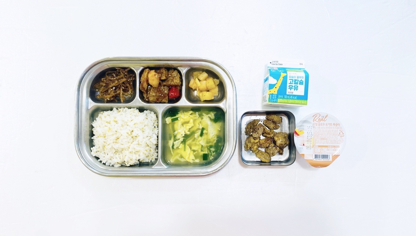2025.5.8(목) 중식식단 - 오전간식:우유 /차조밥,달걀부춧국,돼지고기파프리카폭찹,우엉조림,배추김치 (후)떠먹는 요쿠르트&견과류