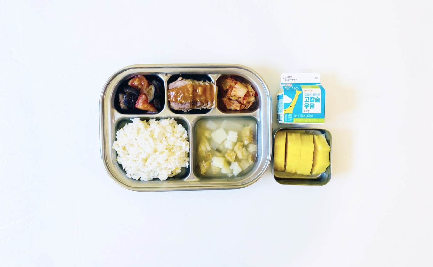 2025.5.12(월) 중식식단 - 오전간식:우유 /기장밥,황태감잣국,돼지고기수육&쌈장,토마토가지볶음,배추김치 (후)파인애플