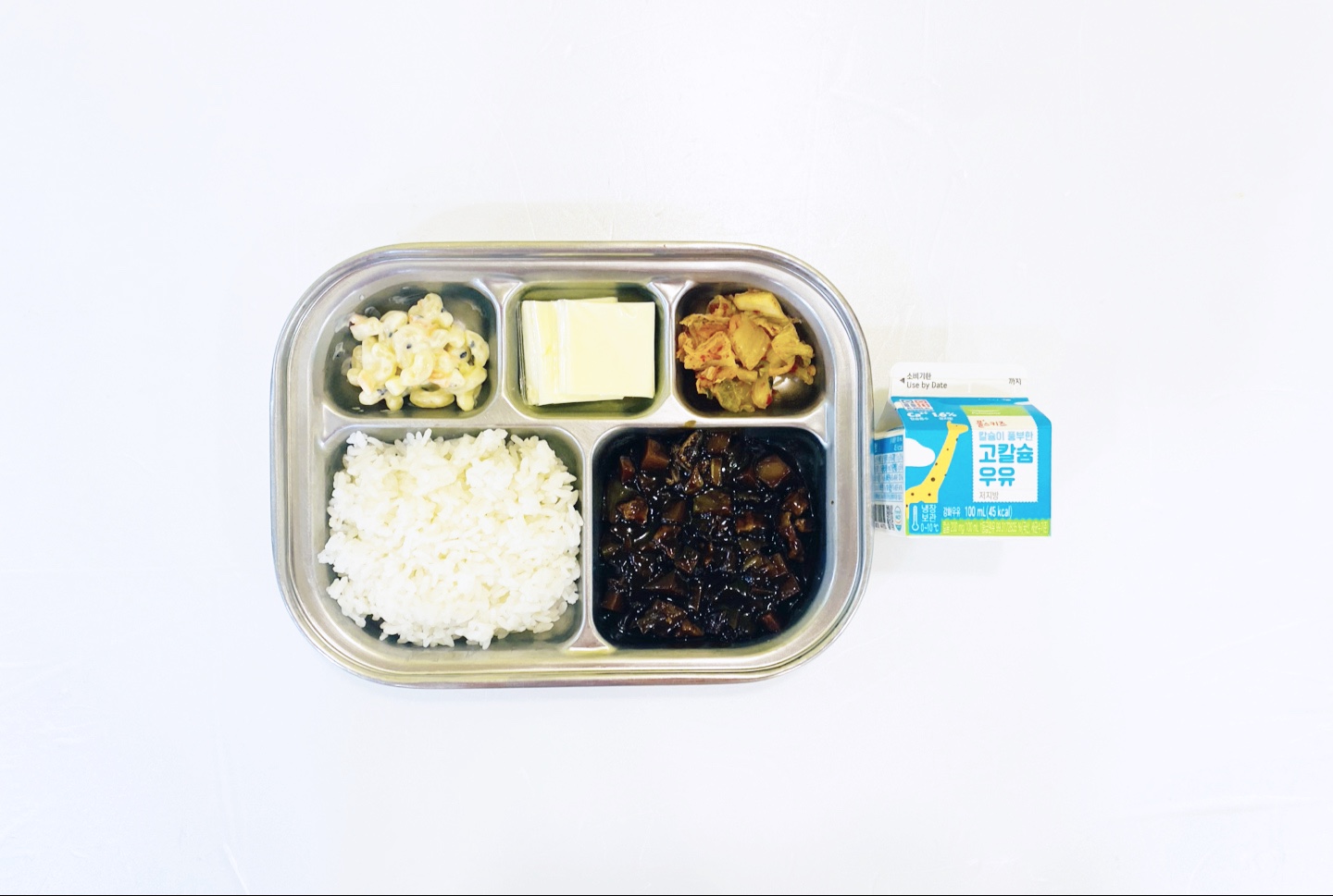 2025.4.22(화) 중식식단 - 오전간식:우유 /돼지고기짜장밥,마카로니샐러드,배추김치 (후)치즈