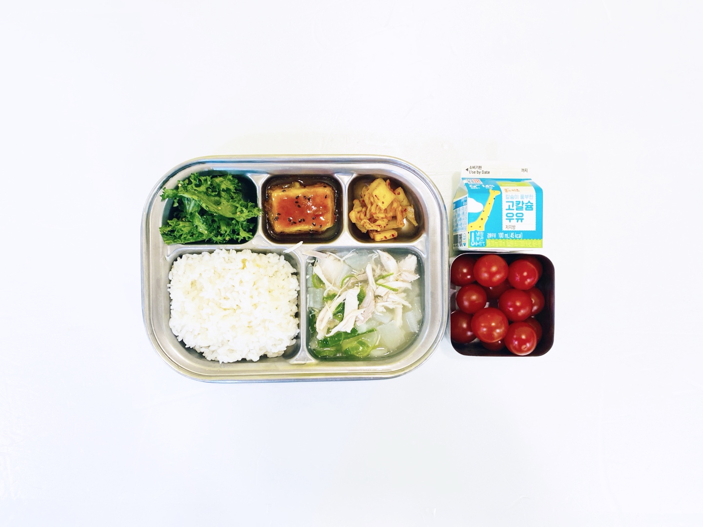 2025.4.23(수) 중식식단 - 오전간식:우유 /백미밥,닭곰탕,두부강정,치커리유자청무침,배추김치 (후)방울토마토