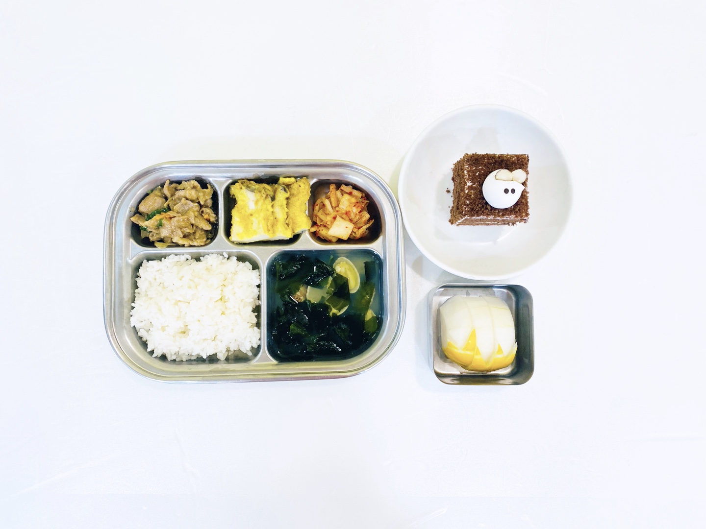 2025.4.24(목) 중식식단 - 백미밥,바지락살미역국,돼지불고기,새송이버섯전,배추김치 (후)참외,케이크