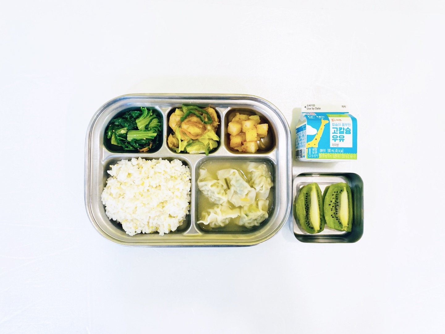 2025.4.25(금) 중식식단 - 오전간식:우유 / 기장밥,만둣국,닭살채소볶음,얼갈이무침,깍두기 (후)키위