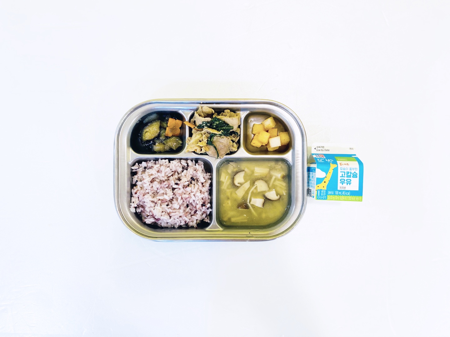 2025.4.28(월) 중식식단 - 흑미밥,버섯된장국, 돼지고기깻잎볶음, 가지나물,깍두기 (후)우유