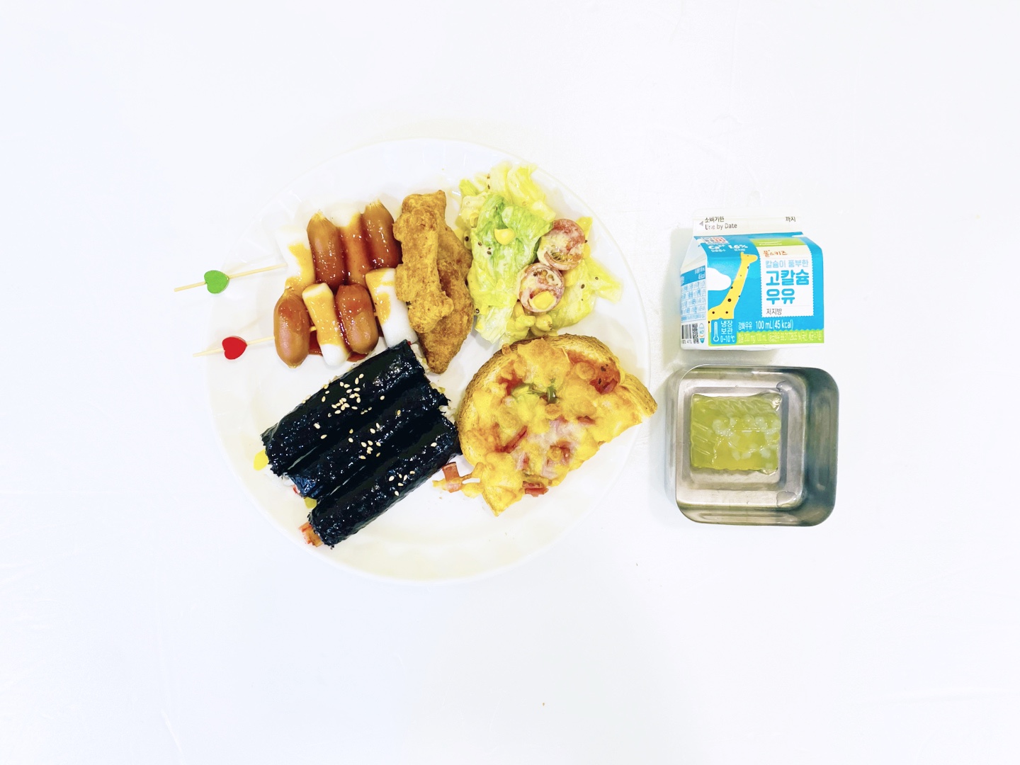 2025.4.29(화) 중식식단 (애찬나누기) - 아침간식:우유 / 꼬마김밥,피자토스트,소떡소떡, 야채샐러드, 치킨너겟,(후)샤인머스캣푸딩