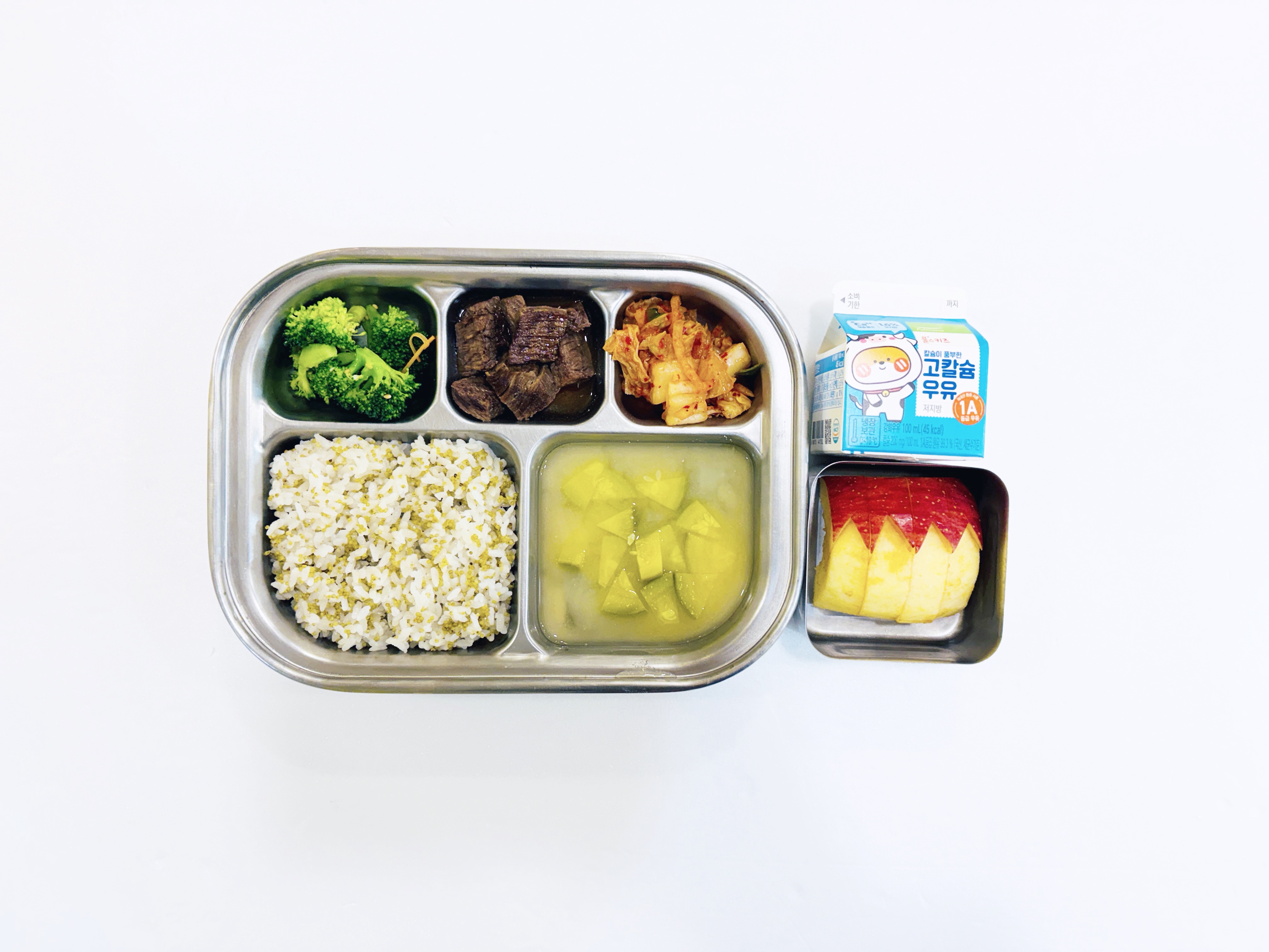 2026.3.24 (화) 중식식단 - 아침간식: 우유 /차조밥,애호박된장국,쇠고기장조림,브로콜리무침,배추김치 (후) 사과