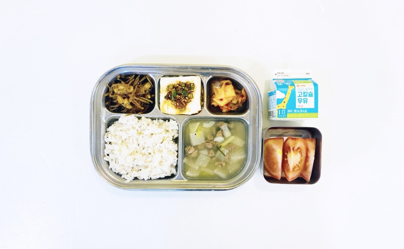 2025.4.4(금) 중식식단 - 오전간식:우유 / 보리밥,쇠고기뭇국,온두부&양념장,우엉견과볶음,배추김치 (후)토마토