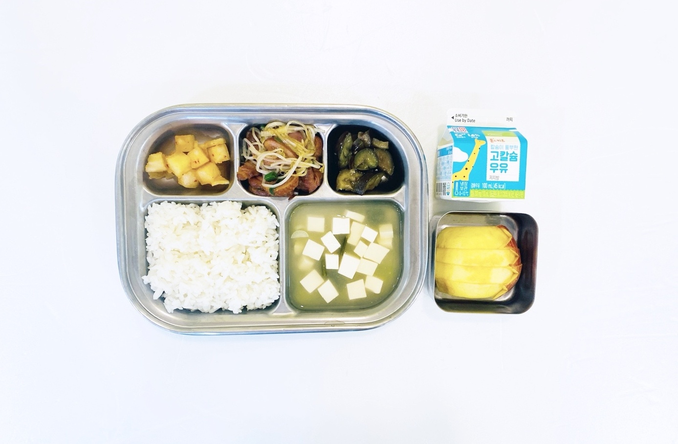 2025.4.7(월) 중식식단 - 오전간식:우유 / 차조밥,참치미역국,달걀말이,감자조림,깍두기 (후)떠먹는 요구르트,견과류
