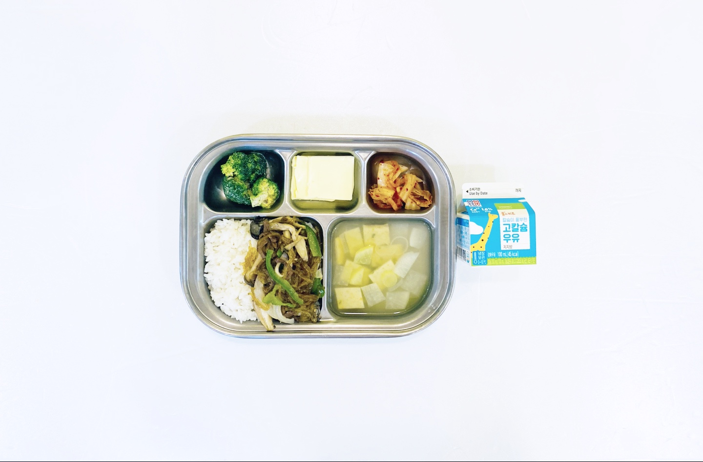 2025.4.9(수) 중식식단 - 오전간식:우유 / 쇠고기잡채덮밥,어묵국,브로콜리무침,배추김치 (후)치즈