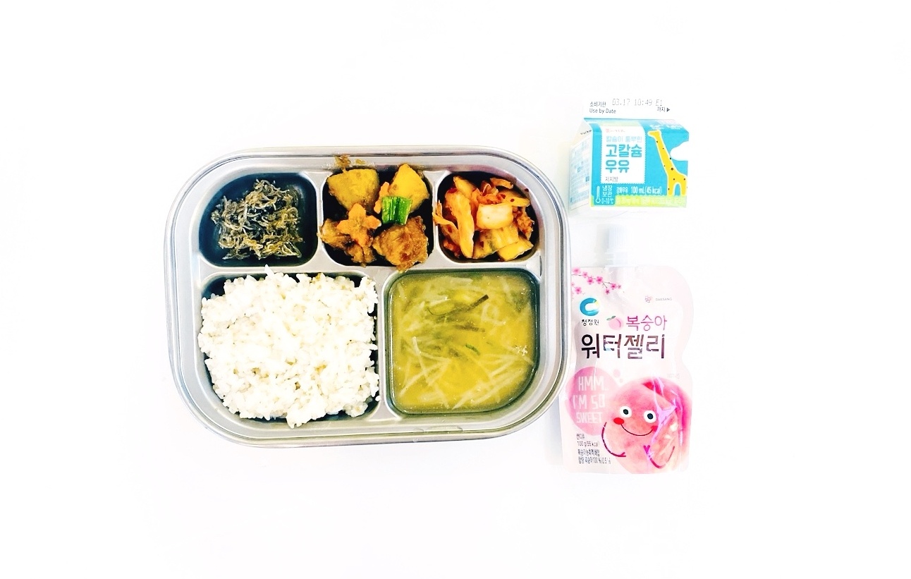2025.3.10(월) 중식식단 - 차조밥,무채된장국,돼지고기고구마조림,잔멸치볶음,배추김치 (후)복숭아젤리,우유