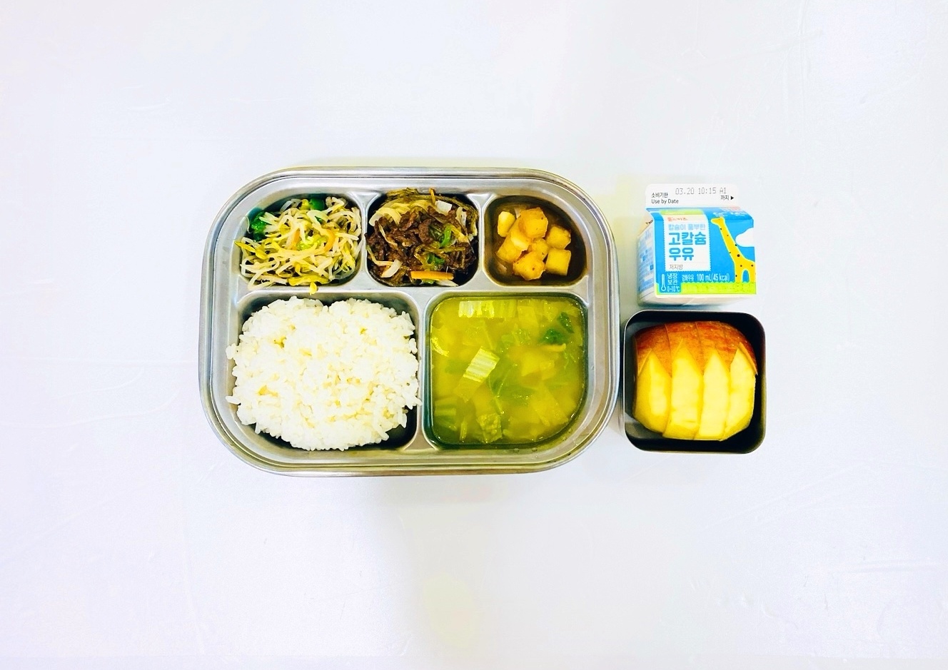 2025.3.12(수) 중식식단 - 백미밥,건새우배춧국,쇠고기당면조림,숙주나물,깍두기 (후)사과,우유