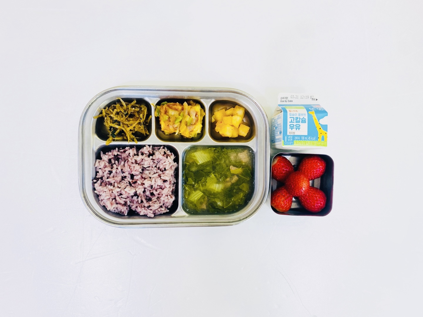 2025.3.17(월) 중식식단 - 흑미밥,쇠고기얼갈이국,두부굴소스조림,우엉볶음,깍두기 (후)딸기,우유